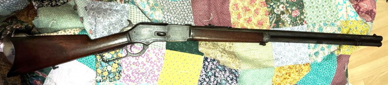 Nun zur WINCHESTER um die es hier geht. Es ist eine „late seconde model“ 1876 Winchester ehem. Im Kal. .45-75 WCF. Sie verfügt über einen 28 Inch langen Rundlauf. Die Waffe ist mechanisch TOP nur schießen geht nicht mehr!