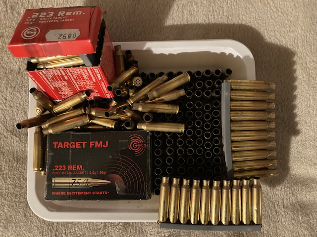 Hallo! Auktion für Schützenkamerad. Sie bieten auf 270 Stück .223Rem.-Hülsen von der Firma " GECO ". Die Hülsen sind aus Messing mit Boxerzündung sie sind nicht bearbeitet oder gereinigt so wie sie vom Stand kommen. 200St. sind auf Ladestreifen 70St. in ihren Verpackungen so wie auf dem Bild zu sehen. Es sind noch weitere Hülsen und Kaliber vorhanden. Kein Versand ins Ausland nur an Inlandsanschriften. Da Privatverkauf keine Garantie, Rücknahme oder Nachverhandeln. Viel Erfolg beim bieten.