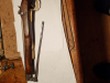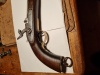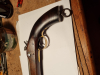 Perkussionspistole nach englischem Muster, Länge 40cm, Lauf 24cm, Cal. 14,9mm, Gezogener Lauf, Damast, Schloss mit zwei Rasten. Schalt Mündungsseitig repariert.
