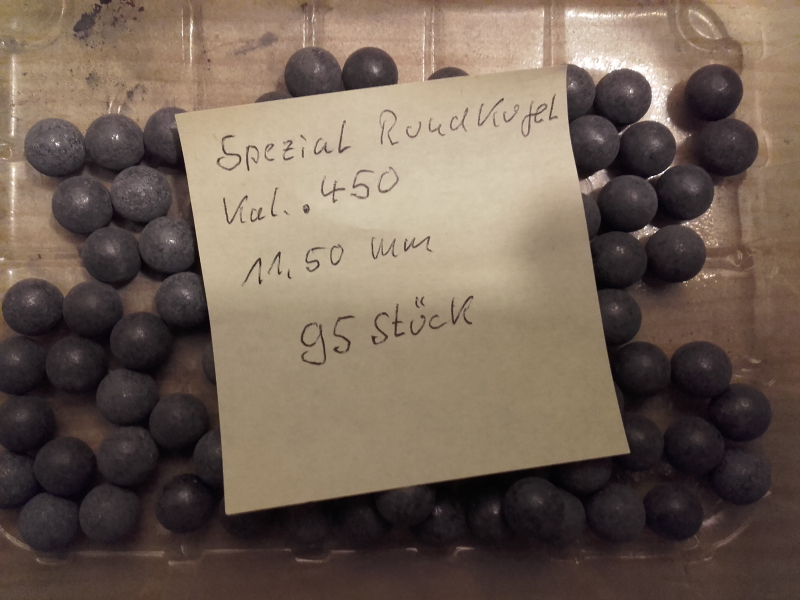 Vorderladerbleirundkugeln, Kal. 450, 11,50 mm, 95 Stück aus Nachlass abzugeben, siehe Foto. Der Versand erfolg als DHL Maxibrief. Achtung! Kein internationaler Versand.