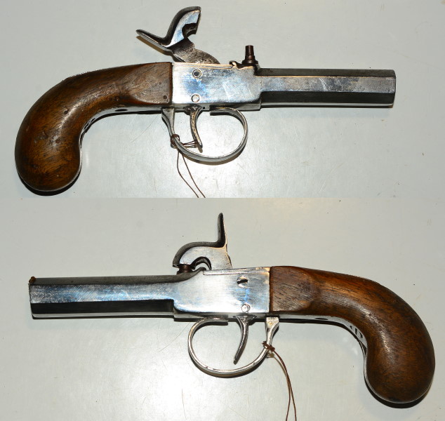 kleines Perkussions-Terzerol um 1860/70, keine Stempelung, vernickelt, Lauflänge 6,2 cm, Gesamtlänge 17,4cm, Kaliber 10,8 mm, rechte Griffschale einige oberflächliche Tierfraßstellen, die kaum auffallen, ansonsten guter bis sehr guter Zustand