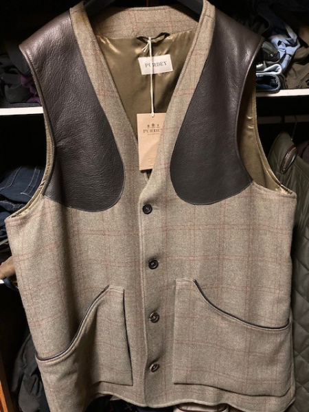 Veräußert wir eine Neue bzw. Gelagerte Purdey Schießweste Tweed in Engl Größe 48 müsste XXXL echter Leder Besatz incl. Einlage die man von links nach rechts wechseln kann .