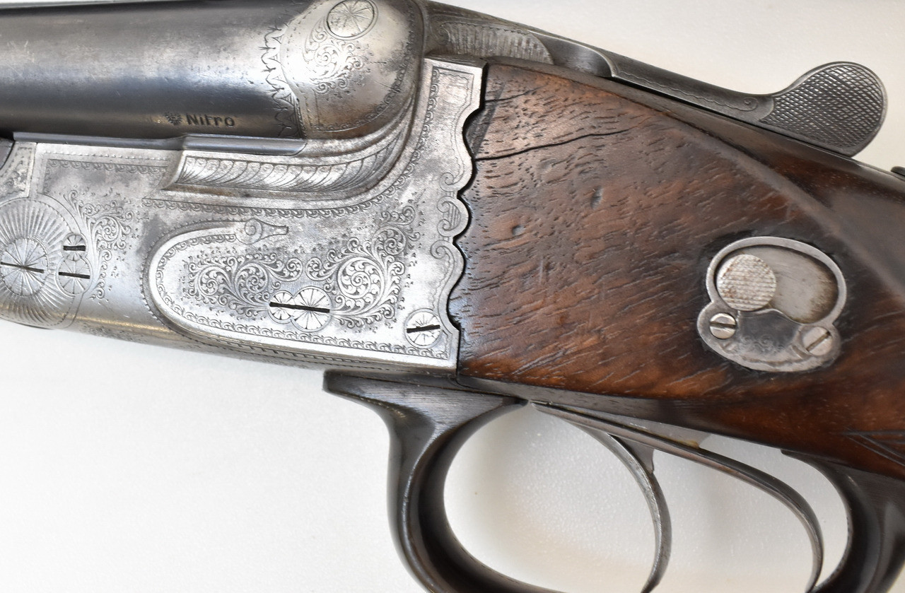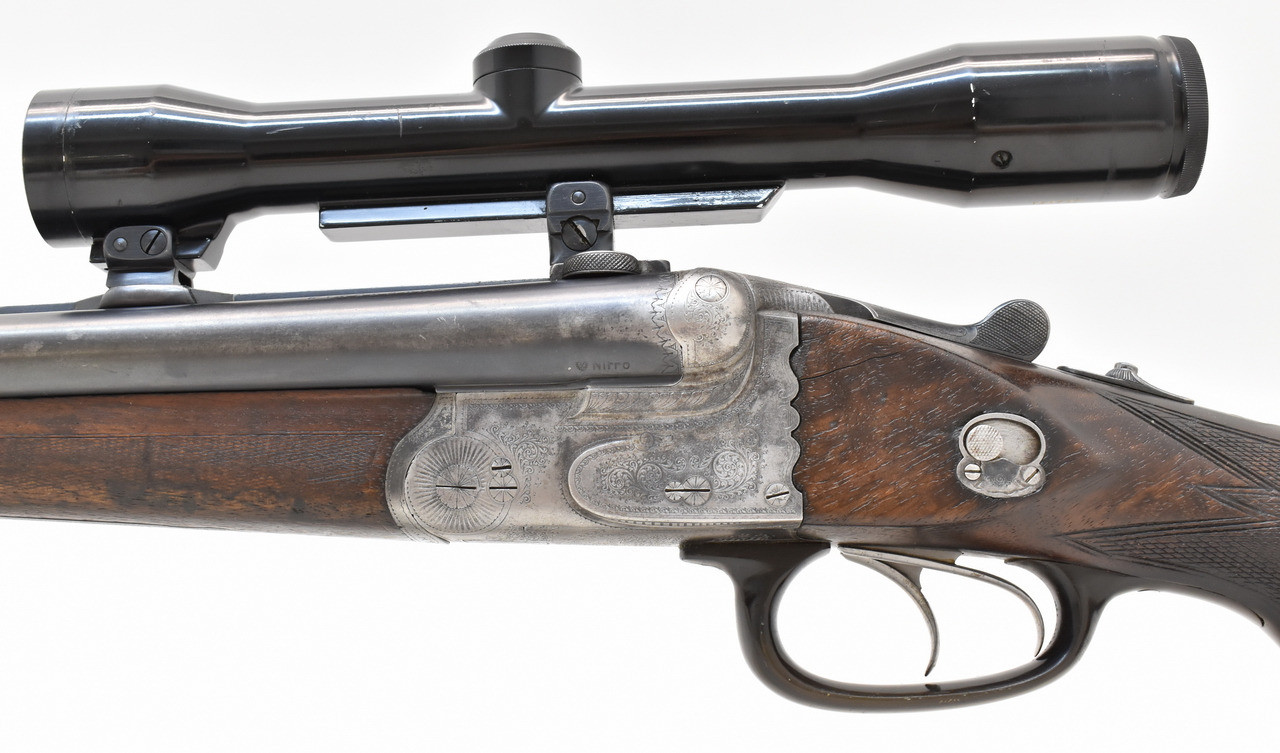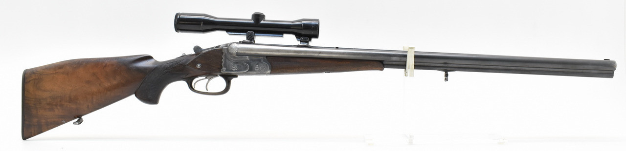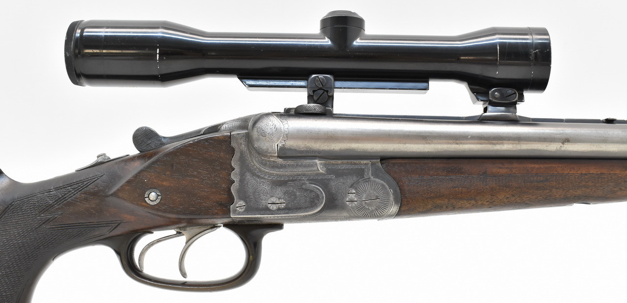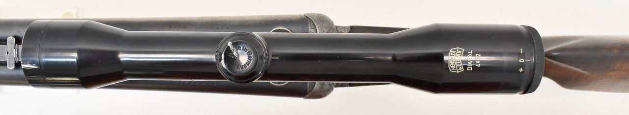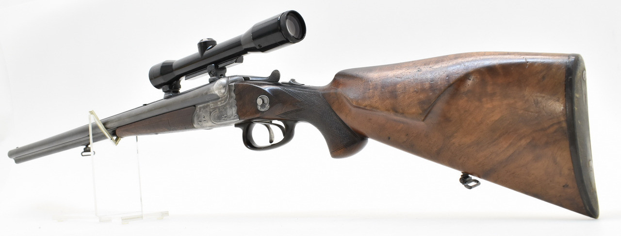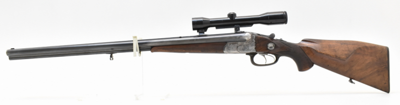 Drilling der Firma W. Heym, aus Suhler Produktion Seitliche Sicherung Umschaltung von Kugel auf Schrot auf dem Schaftrücken. Leicht mattes Laufprofil, strammer Verschluss. Beschuss von 04/25. Schaftlänge 35cm, mit Bayrischer Backe und Pistolengriff. (gemessen vorderer Abzug bis Mitte Gummischaftkappe) Montiert mit einem Hensoldt ZF Diatal 4x32 Abs.1. Die Waffe hat zwei Risse links an der Basküle.