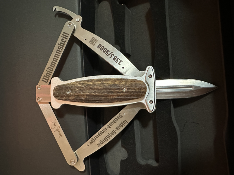 Die Besonderheit dieses hirschfängers liegt an seinem Mechanismus welcher es nach dem deutschen Waffenrecht aus dem führungsverbot ausschließt (das Messer darf geführt werden)