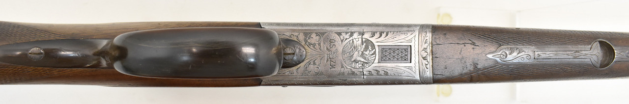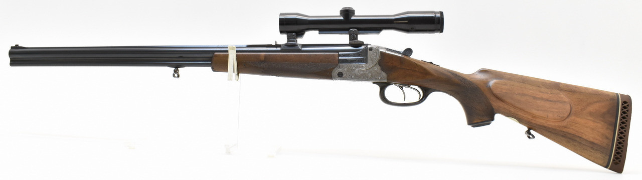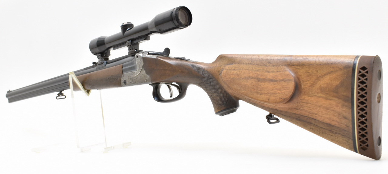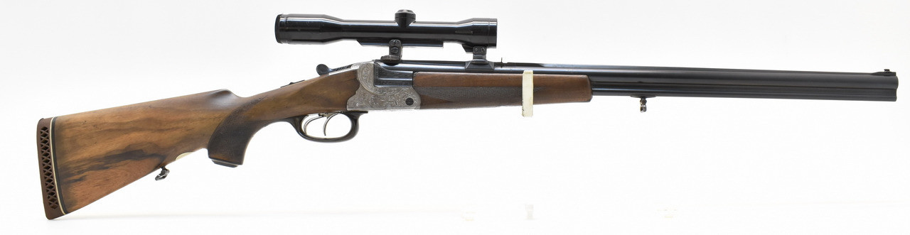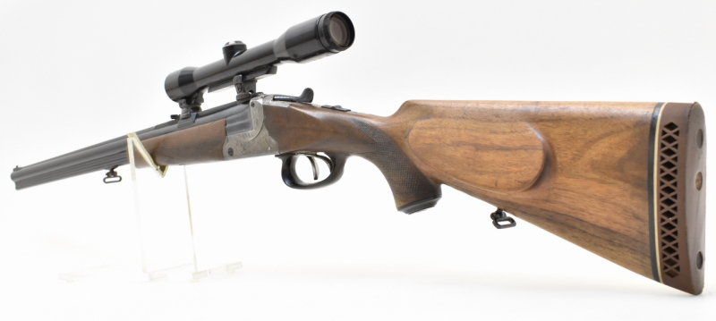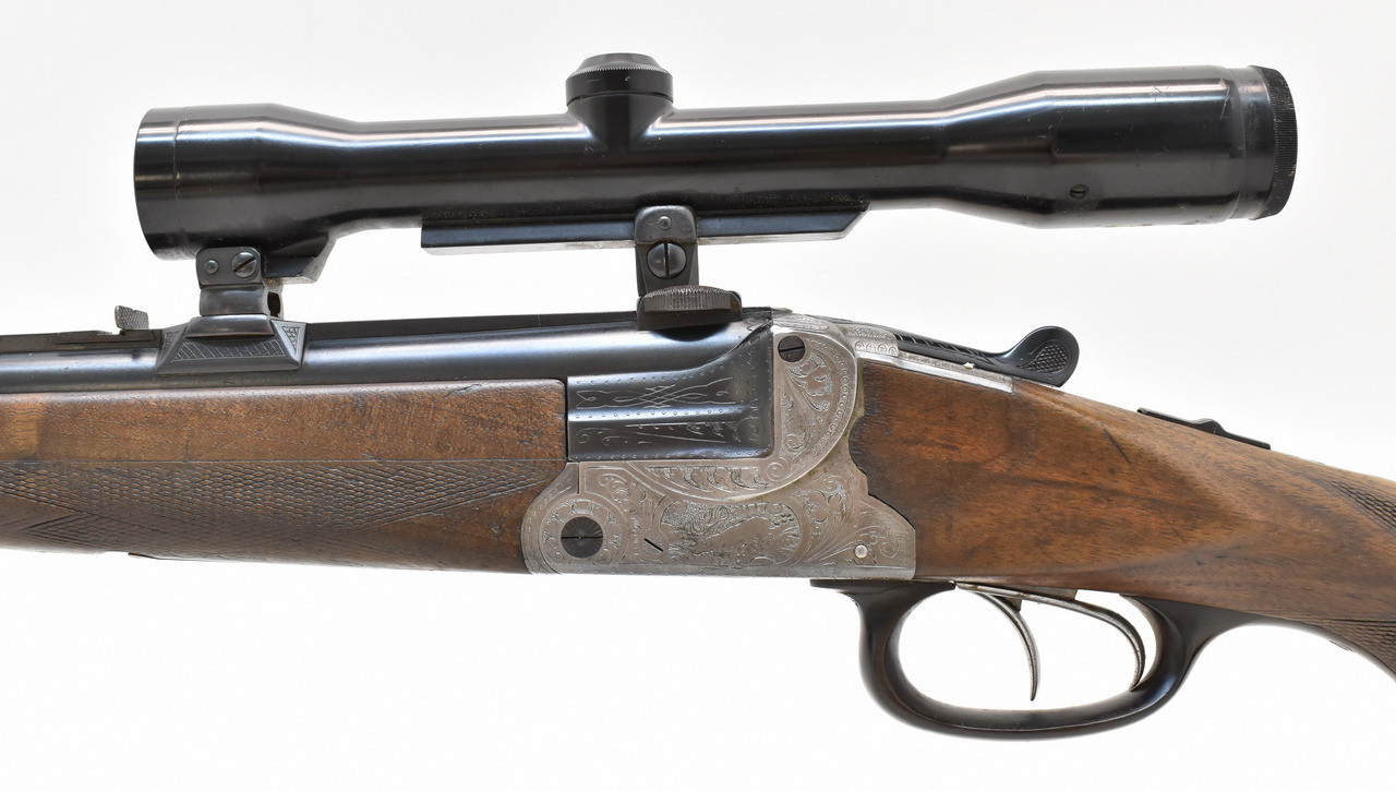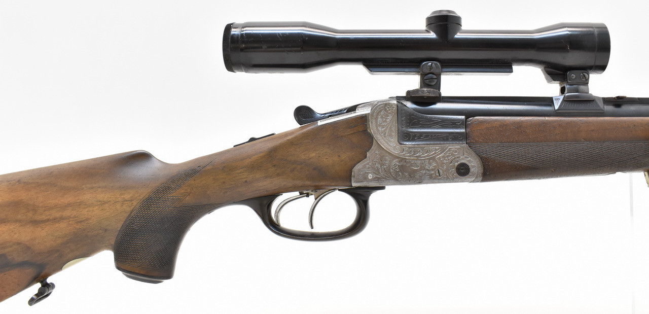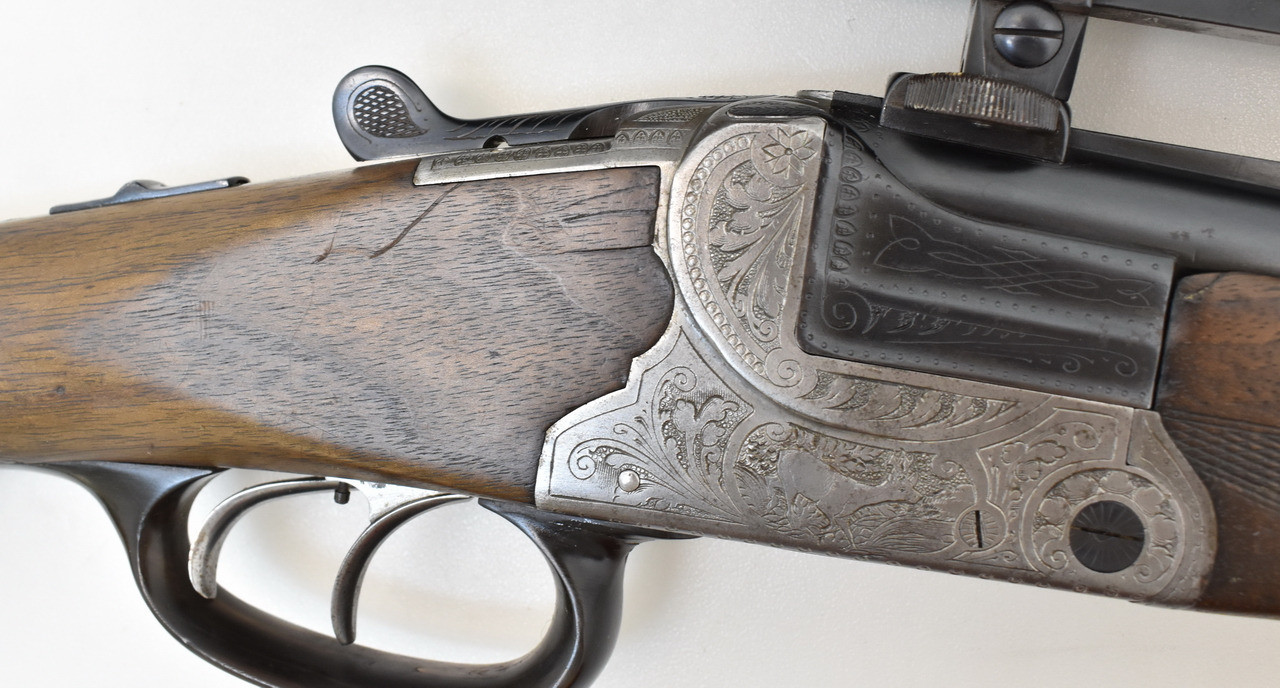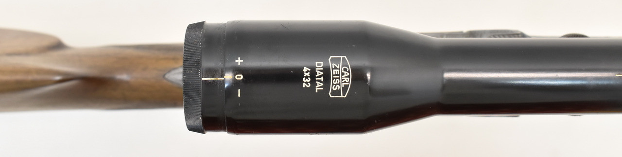 Elegante Bockbüchsflinte mit leicht mattem Kugellauf, die Schrotläufe sind blank. Vorderer Abzug mit Rückstecher, Schiebesicherung auf dem Kolbenhals. Kleine Rostnärbchen sind in der Brünierung und an allen Metallteilen vorhanden. Rechts neben der Basküle sind kleinere Risse. Montiert ist ein Carl Zeiss ZF 4x32 Abs.1. Schaftlänge 36,5cm, mit Backe und Pistolengriff. (gemessen vorderer Abzug bis Mitte Gummischaftkappe) Beschuss von 1940.