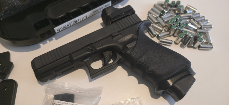 Die Pistole wurde mit einem Grace Optics Red dot versehen, einem erweiterten Aluminium Magazintrichter. Einem Gummiüberzug am Griff, sowie Magazinerweiterungen, eine Verbaut , eine noch in OVP ( FMA ) und eine lose.