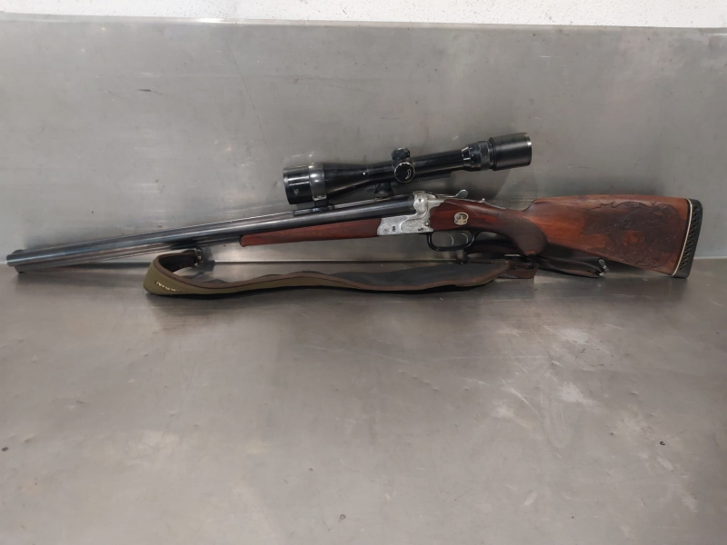 F.W. Heym Drilling, aufwendige Schaftschnitzerei links,Abzugssicherung auf der liken Seite, Schwenkmontage montiert mit Zielfernrohr