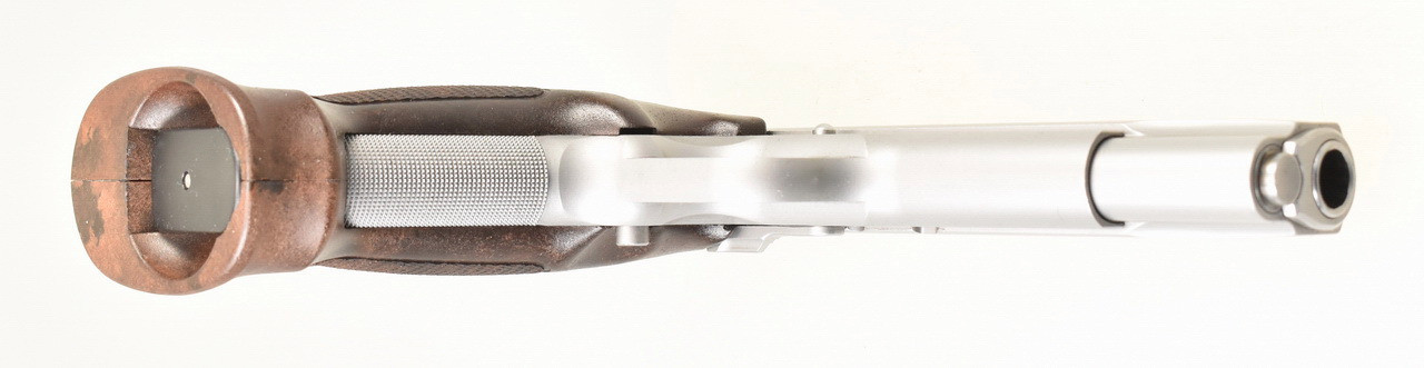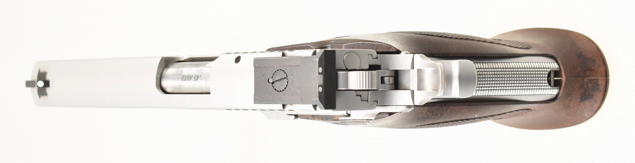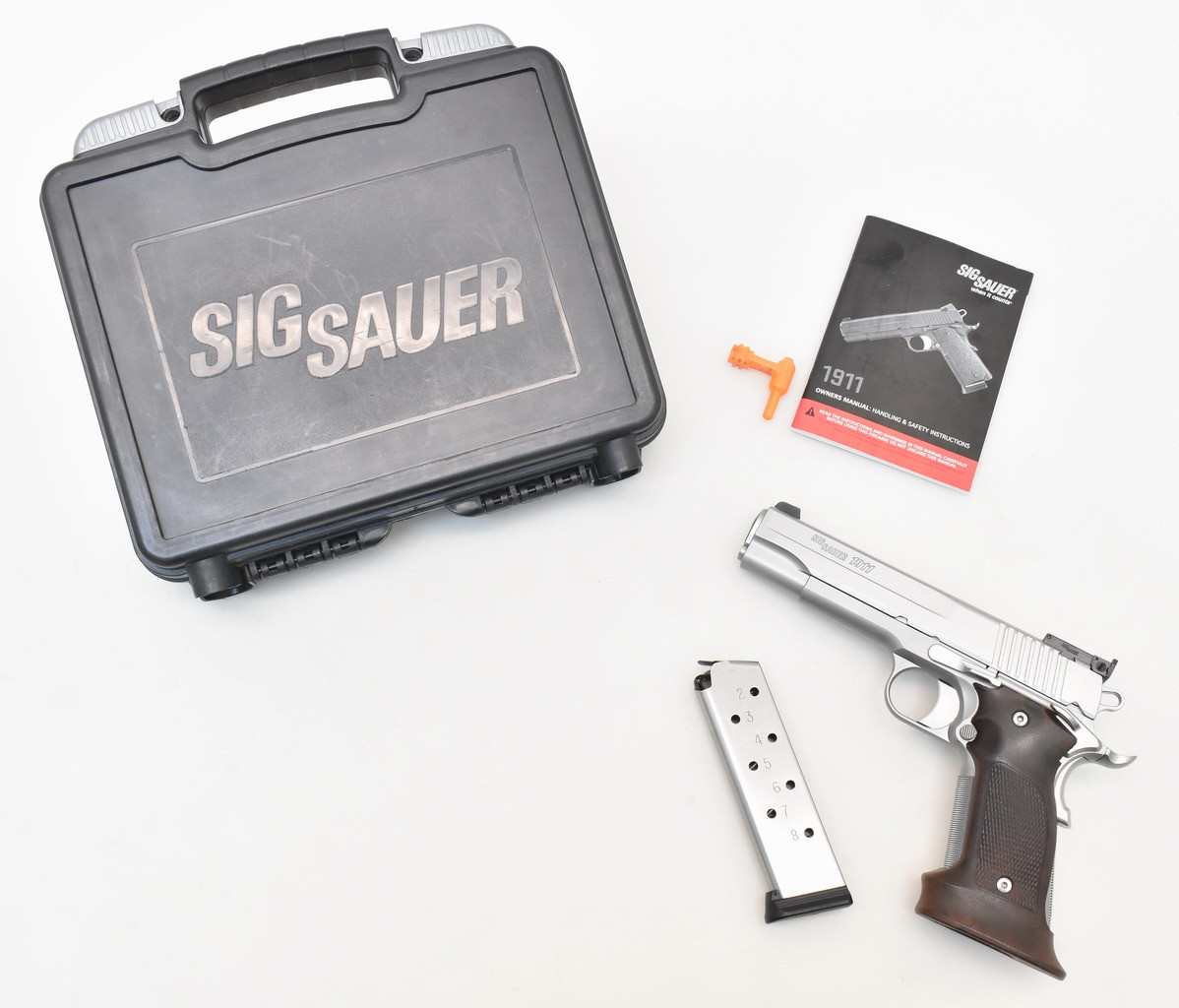 Gebrauchte Stainless - Steel Pistole auf bewährter " COLT Government " Basis aus amerikanischen Produktion der SIG SAUER Inc., Exeter, New Hampshire Modell 1911 " Target ". Spiegelblanker Lauf mit klassischer Ketten - Verriegelung. Beschuß 2019. Griffstückvorderseite und Schlagfedergehäuse mit Checkering. Abzug mit Triggerstop. Höhen- und seitenverstellbare Mikromtervisierung. Balkenkorn und Kimmenblatt mit Kontrastmarkierungen. 172mm lange Visierlinie. Verlängerte " Bianchi Cup " Style Holzgriffschalen mit Fischhautmuster. Die Pistole wird im SIG - Sauer Kunststoffkoffer mit Bedienungsanleitung und Reservemagazin geliefert. Details siehe Bilder.