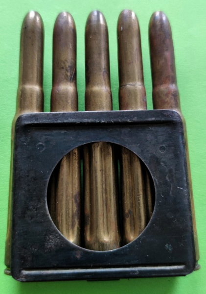 Angeboten wird ein Satz aus 5 Exerzierpatronen im originalen Rahmen, wie sie zu einem Karabiner 88, Gewehr 88 und Gewehr 91 ausgegeben wurden.