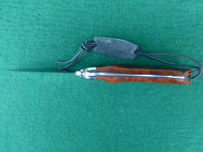 Das angebotene DNC Messer ist in Handarbeit gefertigt. Der verwendete Stahl ist ATS 34 und das Edelholz nennt sich Schlangenholz. Die Klingenlänge ist 95mm, die Gesamtlänge beträgt 210mm. Dazu gehört die in Handarbeit gefertigte Lederscheide mit Lederinnenfutter.