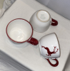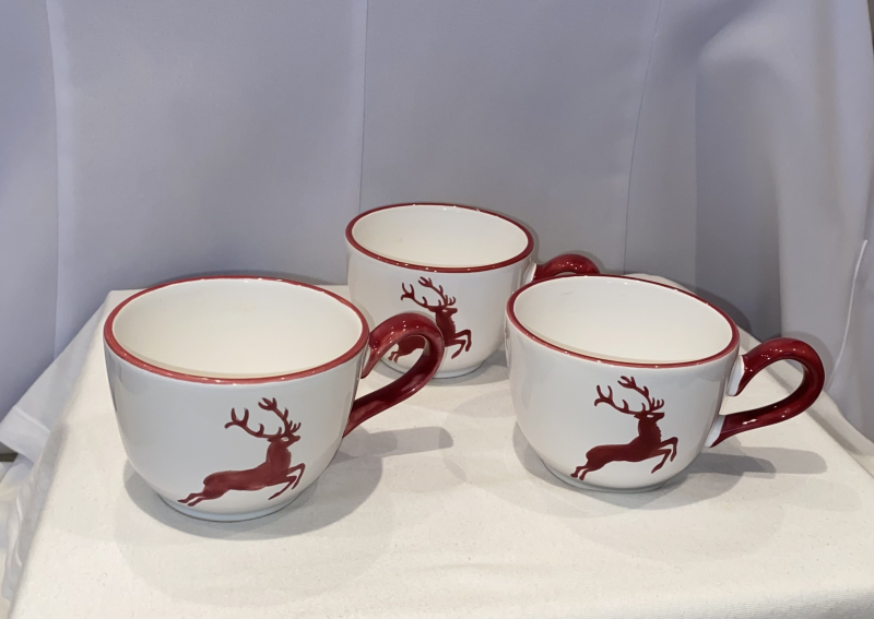 Biete hier 3 edle Jagdtasssen der Fa. GMUNDNER KERAMIK aus Österreich an. Grundfarbe weiß mit handgemaltem rotem Hirsch. Der Neupreis einer Tasse liegt sonst bei ca. 35,- Euro. Das Leergewicht einer Tasse beträgt ca. 230 Gramm, Volumen etwa 0,2 Liter, Tassenhöhe ca. 6,5 cm - oberer Durchmesser etwa 9,5 cm, glatte Oberfläche, spülmaschinenfest.