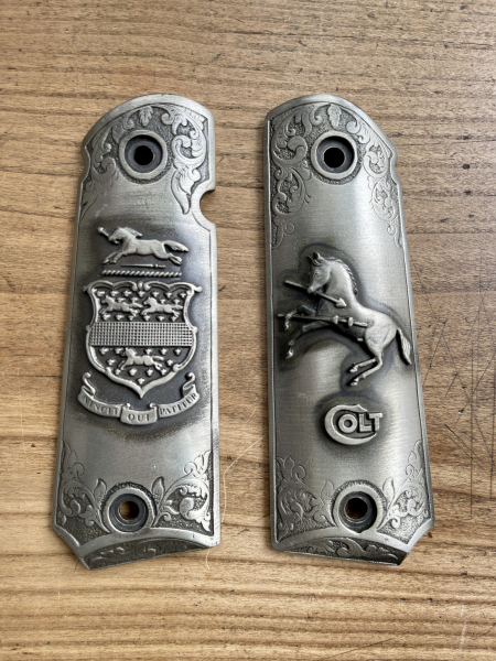 Rare Colt 1911 Custom Shop Griffschalen aus Zinn von Sid Bell („The Alsakan Silversmith“)! Diese Griffe wurden noch zu Lebzeiten von ihm gefertigt, es handelt sich nicht um die Repros (ab ca. 2008 gefertigt und ohne die Colt Signaturen), die es günstig gibt. Die Griffe sind signiert und stammen von 1979. Erzielen in den USA Auktionspreise von ca. USD 500. Zustand siehe Fotos, Privatverkauf, keine Garantie oder Rücknahme, Versand innerhalb der EU € 18,00