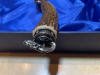 Handgeschmiedet Solingen 440C-Stahl, Hirschhorn-Griff mit Handböller am Griffende, Lederscheide.
