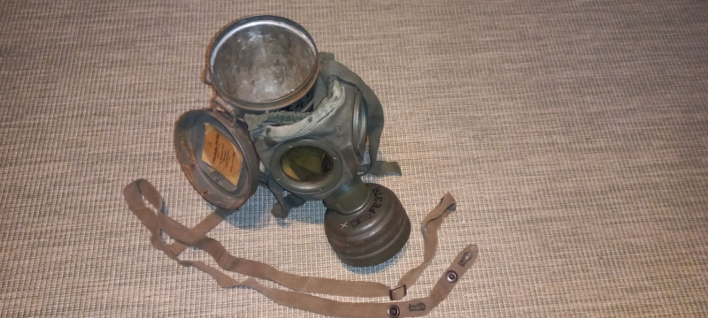 Die Maske hält noch ihren Filter von 1937. Sie ist in der Größe "2". Das Material ist geschmeidig, keinesfalls brüchig. Wäre meines Erachtens aufsetzbar wenn man es drauf anlegen würde. Top Zustand!