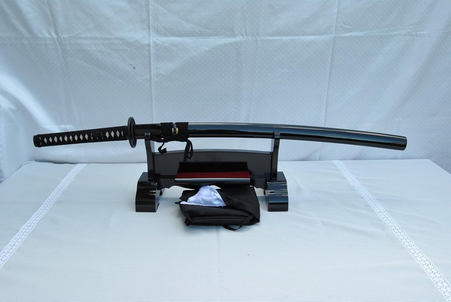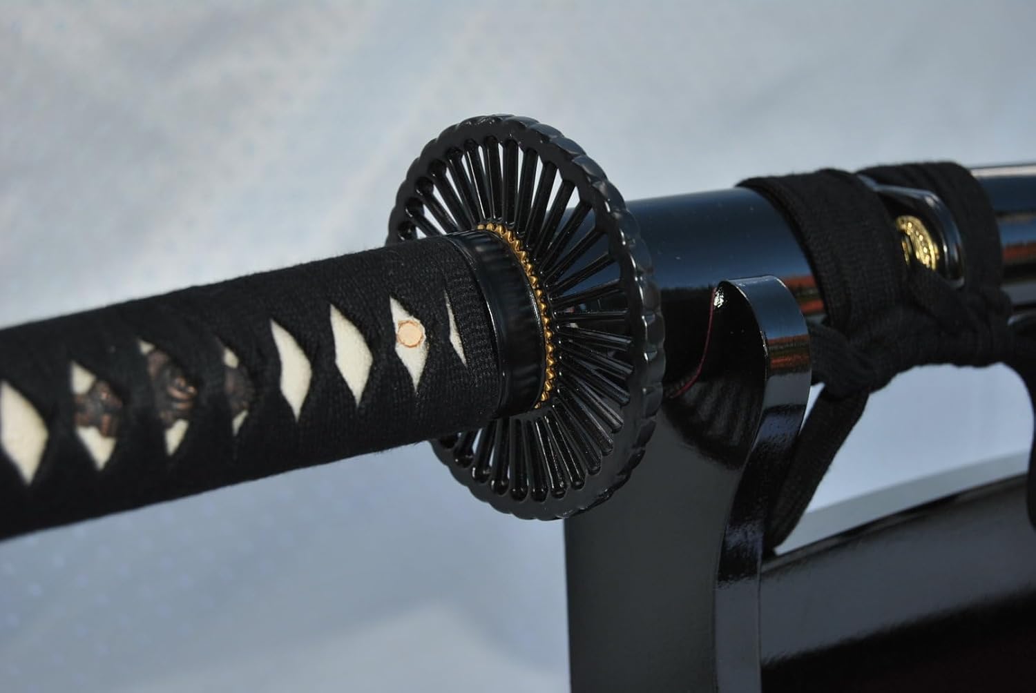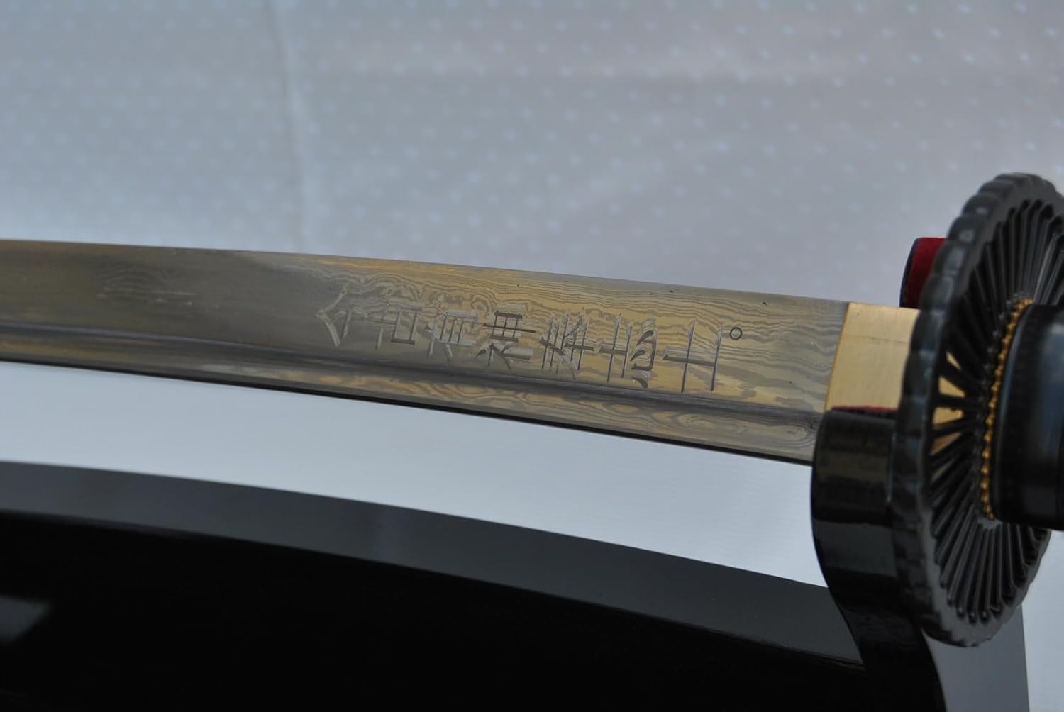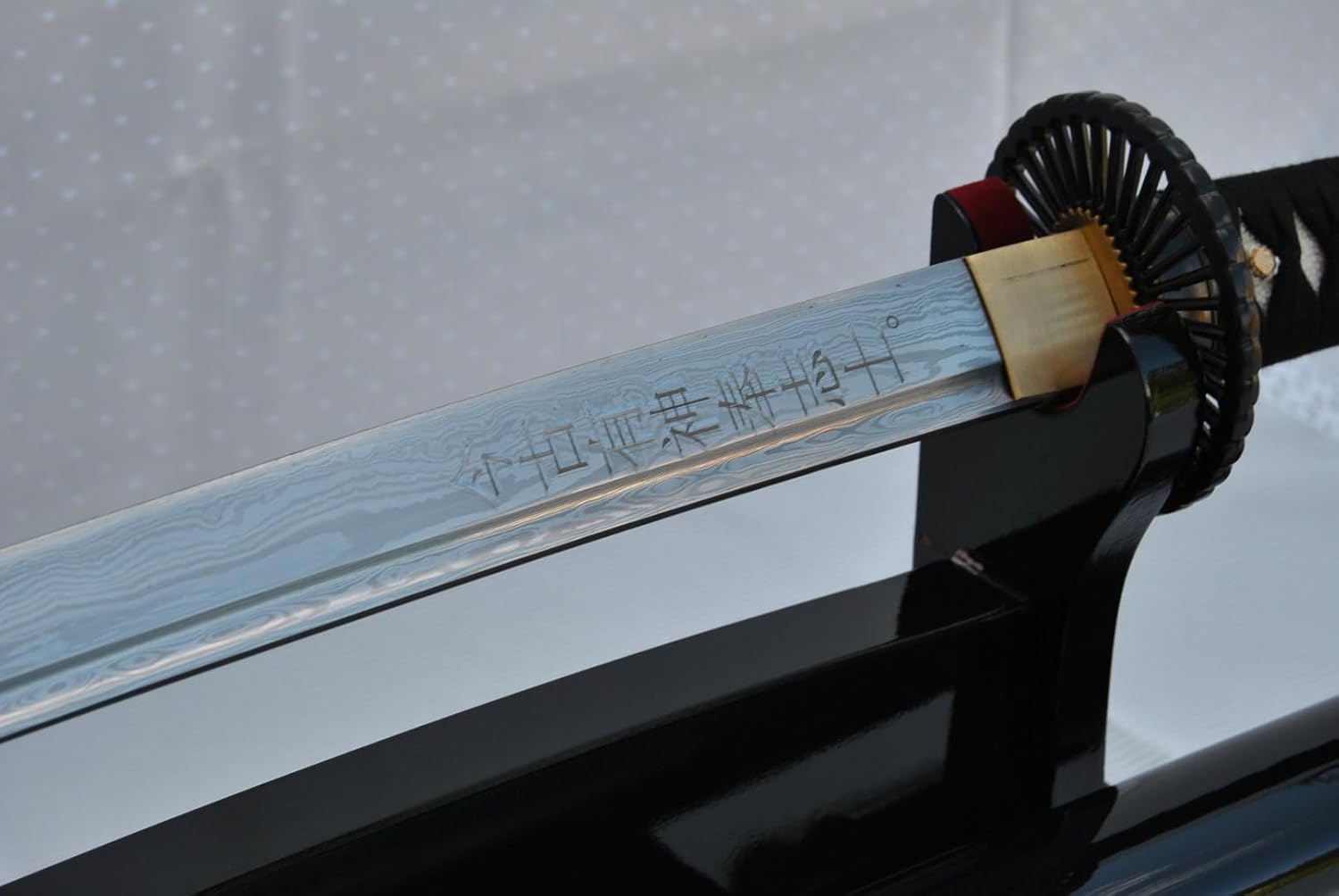 Wunderschöne Handgeschmiedete/ Gefaltete Last Samurai Schwert aus aller besten Stahl 1095 die durch das harmonische Zusammenspiel mit Saya und Tsuka zu einem vollkommenen Kunstwerk gemacht wurde. Das Schwert wird mit Schwertbeutel geliefert. Die gesamte Länge des Schwertes ist 104cm, die Klingenlänge 73cm und der Griff ist 28cm lang.Klingenbreite: 3,2 cm cm Klingenrücken: 8 mm Die Saya ist Schwarz lackiert. Die Zubehörteile haben ein Last Samurai Design und sind aus Metall, der Habaki ist aus massiven Messing. Der Griff ist aus Holz und in Rochenhaut eingelegt. Es handelt sich jedoch nicht um ein Paul Chen Erzeugnis. Das Schwert wird von einem Schwertschmied mit langjähriger Erfahrung in Handarbeit kunstvoll gefertigt und nicht wie bei anderen Herstellern mit Hilfe von Maschinen hergestellt. Jedes einzelne Schwert wird von dem Schmied auf traditionelle Weise und mit höchster Sorgfalt angefertigt. Dieses Schwert ist nicht nur ein Kunstwerk das in höchstem Maße dekorativ ist, sondern es ist auch sehr scharf und vollkommen geeignet für echte Kämpfe und Schnittübungen. Es zerteilt mühelos armdicken Bambus oder gleitet nahezu unspürbar durch ein Blatt Papier. Wird nach traditioneller Weise gehärtet und hat an der Schneide eine Rockwellhärte von 60 Grad und am flexibleren Rücken eine Härte von 40 Grad Rockwell. Die Klinge besitzt eine BO-HI.Die Klinge ist, zwecks Größerer Sicherheit, mit zwei mekugi (Bambus Zapfen) befestigt. .OHNE STÄNDER