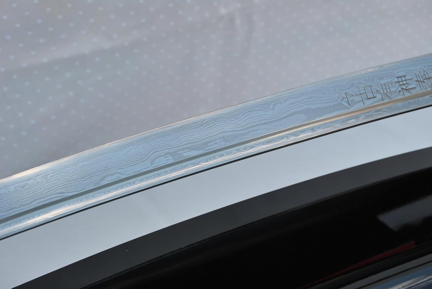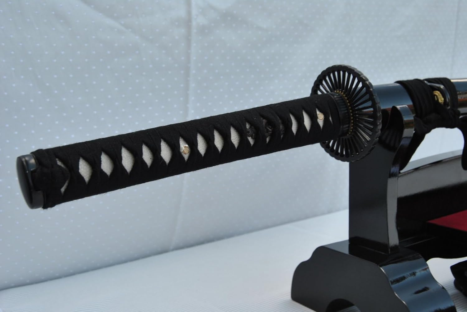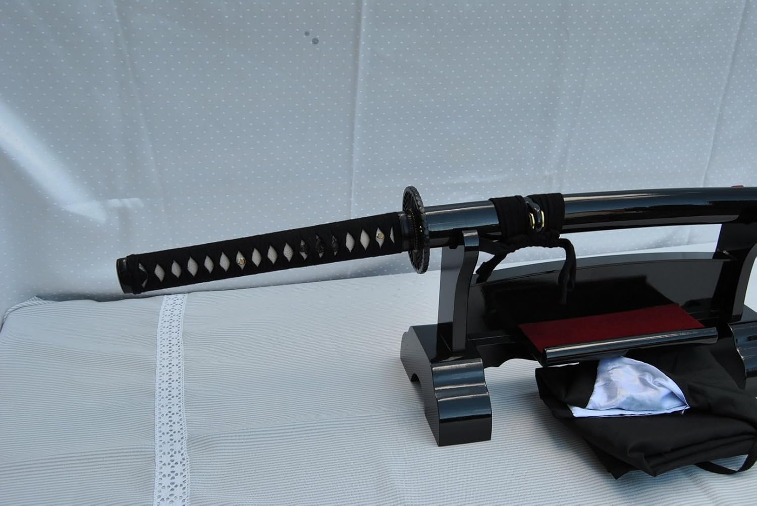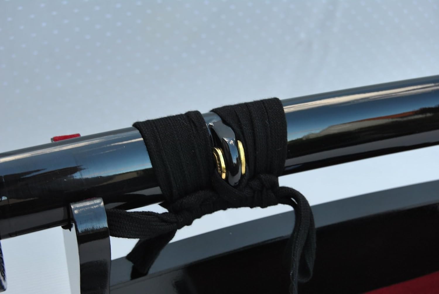 Wunderschöne Handgeschmiedete/ Gefaltete Last Samurai Schwert aus aller besten Stahl 1095 die durch das harmonische Zusammenspiel mit Saya und Tsuka zu einem vollkommenen Kunstwerk gemacht wurde. Das Schwert wird mit Schwertbeutel geliefert. Die gesamte Länge des Schwertes ist 104cm, die Klingenlänge 73cm und der Griff ist 28cm lang.Klingenbreite: 3,2 cm cm Klingenrücken: 8 mm Die Saya ist Schwarz lackiert. Die Zubehörteile haben ein Last Samurai Design und sind aus Metall, der Habaki ist aus massiven Messing. Der Griff ist aus Holz und in Rochenhaut eingelegt. Es handelt sich jedoch nicht um ein Paul Chen Erzeugnis. Das Schwert wird von einem Schwertschmied mit langjähriger Erfahrung in Handarbeit kunstvoll gefertigt und nicht wie bei anderen Herstellern mit Hilfe von Maschinen hergestellt. Jedes einzelne Schwert wird von dem Schmied auf traditionelle Weise und mit höchster Sorgfalt angefertigt. Dieses Schwert ist nicht nur ein Kunstwerk das in höchstem Maße dekorativ ist, sondern es ist auch sehr scharf und vollkommen geeignet für echte Kämpfe und Schnittübungen. Es zerteilt mühelos armdicken Bambus oder gleitet nahezu unspürbar durch ein Blatt Papier. Wird nach traditioneller Weise gehärtet und hat an der Schneide eine Rockwellhärte von 60 Grad und am flexibleren Rücken eine Härte von 40 Grad Rockwell. Die Klinge besitzt eine BO-HI.Die Klinge ist, zwecks Größerer Sicherheit, mit zwei mekugi (Bambus Zapfen) befestigt. .OHNE STÄNDER