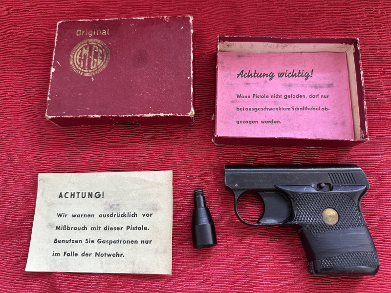 Aus Sammlung diese kleine Rarität !6mm Flob.Knall &Gas,70-er Jahre ,Magazin steckt bzw. bewegt sich nicht ,wenn man durchzieht und abschlägt.Zum überholen als Bastlerstück.Die Bilder als Beschreibung beachten.Von privat ab 1€ ohne Rücknahme.EU-Versandkosten 20€.