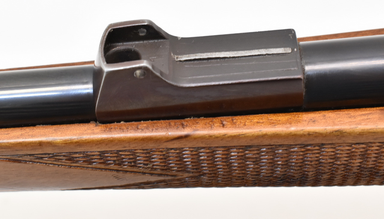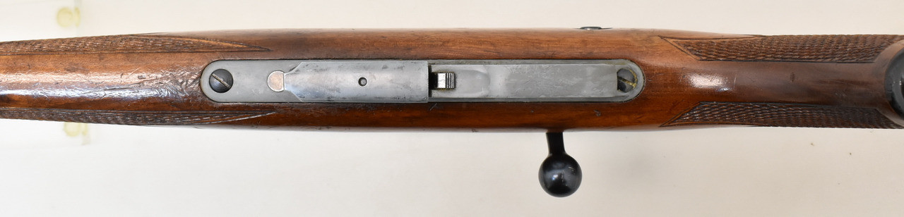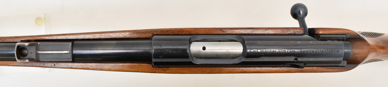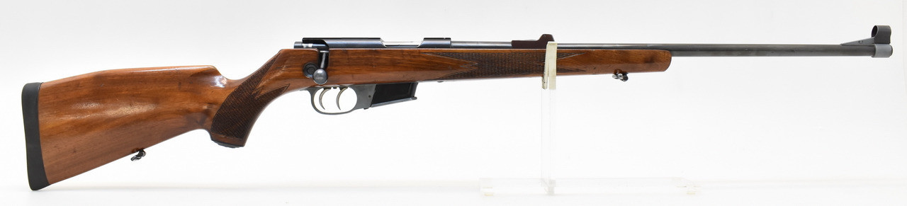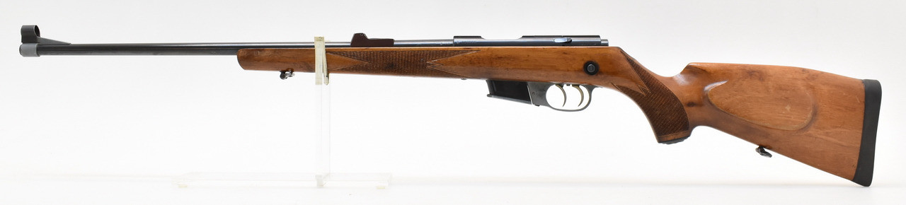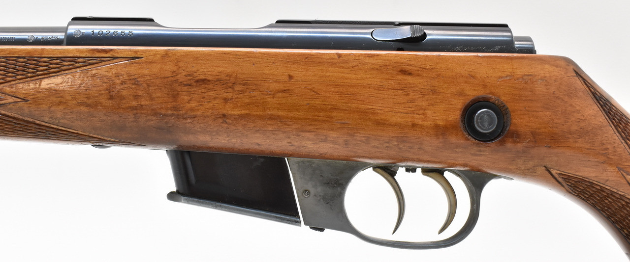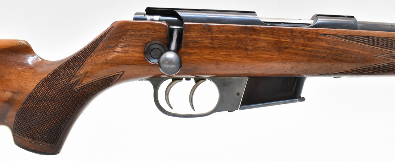 KK-Repetierer mit deutschem Stecherabzug, 5-Schuss Magazin und Druckknopfsicherung. Der Lauf ist spiegelblank, Beschuss von 1967. Die verstellbare Kimme fehlt! Die Schaftlänge beträgt, gemessen vom vorderen Abzug bis Mitte Schaftkappe, 36cm.