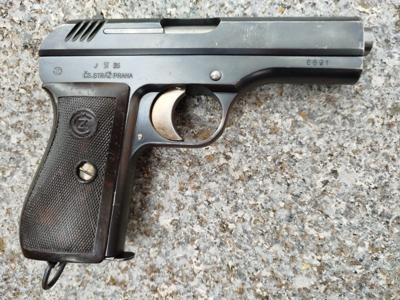AUFGEPASST - zwei neue Bilder eingestellt!!! Ich biete hier eine extrem seltene, frühe Pistole Modell CZ 27 der Polizei Prag an. Griffstück, Verschlußstück und Seitenplatte sind nummerngleich. Der Lauf befindet sich in einem sehr guten Zustand und trägt die interessante Nummer 11111 - wie auch das alte, originale tschechische Beschusszeichen. Der Lauf stammt also definitiv ebenfalls von einer solchen, frühen CZ 27. Eine Waffe mit der Nummer 11133 der Polizei Trebova wurde erst vor wenigen Wochen hier bei egun für € 3510,00 versteigert (egun ID: 20164959). Ich vermute, dass bei dieser Waffe aus Trebova der Lauf ebenfalls nicht nummerngleich war, da der Verkäufer auf Nachfrage lediglich den guten Zustand des Laufs versichert hat, nicht aber dessen Nummerngleichheit. Das Magazin der Trebova Waffe stammte aus der Zeit der deutschen Besatzung. Vermutlich dürfte es sich hierbei also um eine deutsche Beutewaffe gehandelt haben. Das Magazin meiner Waffe befindet sich in einem hervorragenden Originalzustand und trägt keine Kennzeichnungen. Ich denke auch, dass sich meine Waffe in einem besseren Zustand befindet als die Waffe aus Trebova. Eine BRIGANT Kennzeichnung am Abzugsbügel zeugt davon, dass meine Waffe vor vielen Jahren von der Fa. Frankonia nach Deutschland importiert wurde. Diese Waffe hier unterscheidet sich aber in jeder Hinsicht von der sonst üblichen Frankonia Ware aus dieser Zeit, welche überwiegend neu beschossen, überhaupt nicht nummerngleich und komplett neu brüniert worden war. Nach meiner Überzeugung wurde meine Waffe nicht neu brüniert: Sie weist innen wie außen dem Alter und dem Einsatz entsprechende Gebrauchsspuren auf. Der Abzug, der Schlaghebel, der Auszieher, die Griffschalenschrauben und die Halteschraube der Deckplatte sind gelb angelassen. Diese frühen Griffschalen sind nicht einfarbig, sondern dunkelbraun meliert, so wie ich es bisher bei allen sehr frühen Exemplaren beobachtet habe. Ich gehe also sicher davon aus, dass die Fa. Frankonia nichts außer ihrem BRIGANT Schlagstempel an der Waffe verändert hat. Allerdings hat ein Vorbesitzer am Korn der Waffe gefeilt. Das ist mir tatsächlich erst kürzlich bei genauerer Betrachtung aufgefallen. Ein meisterlicher Fachmann könnte das aber vermutlich wieder in einen dem Original entsprechenden Zustand versetzen. Das ist meine unverbindliche Wahrnehmung. Aber beurteilen Sie dies alles bitte selber anhand der Bilder. Bei ernsthaftem Interesse fordern Sie gerne weitere Detailfotos an. Interessenten aus dem Ausland müssen die Ausfuhr der Waffe selber organisieren. Ich liefere erst nach vollständiger Bezahlung an einen vom Käufer bestimmten, lizenzierten Waffenhändler hier in Deutschland, der meine Waffe dann im Auftrag des Käufers in sein Waffenhandelsbuch übernimmt. Alles weitere ist Angelegenheit des Käufers und des von ihm beauftragten Waffenhändlers. Bei Unklarheiten bitte vor dem Bieten fragen! Dies ist ein Privatverkauf, und der Verkäufer erklärt mit seinem Gebot den Verzicht auf Gewährleistung, Umtausch, Rücknahme, Rücktritt und dergleichen!!! Das Versandrisiko trägt alleine der Käufer. Ich versichere aber eine hervorragende Verpackung, und ich beauftrage ein absolut zuverlässiges Unternehmen mit dem Versand. Und bitte stören Sie sich nicht an meinen letzten beiden Bewertungen. Diese habe ich als Käufer von zwei Händlern bekommen, die sich nicht korrekt verhalten haben. Das hat mir für längere Zeit den Spaß an egun verdorben. Aber wie Sie meinen weiteren Bewertungen entnehmen können, hat sich noch nie ein Käufer über mich als Verkäufer beklagt.