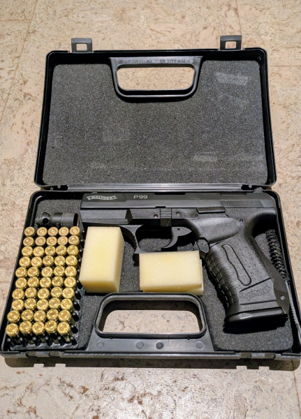 Walther P99 Schreckschusspistole im Koffer mit Abschussbecher und 50 Platzpatronen