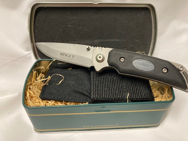 Taschenmesser von Martiini, absolut unbenutzt, in einer schöner Metall Dose. Passende Messerscheide aus Kodura ist auch dabei.