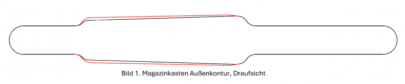 • Der Magazinkasten ist im Bereich des Magazins etwas breiter (Rot in Bild 1) als der original Magazinkasten. Er muss in den Schaft eingepasst werden. Dazu eignen sich Feilen, Beitel und Handfräsmaschinen („Dremel“).