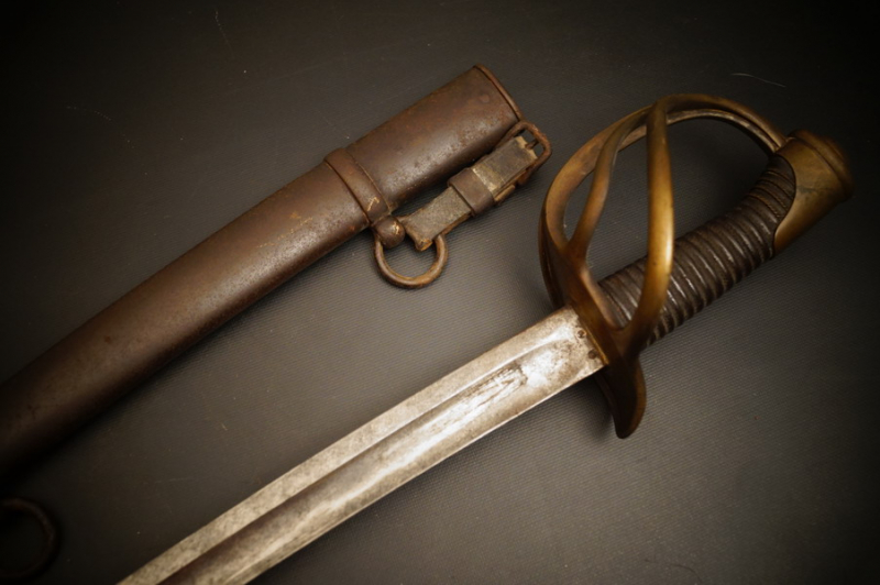 Fundzustand. Massive große Scheide und passgenaue massive Klinge mit besonderem Schliff im vorderen Bereich - an der Kehlung vorderseitig fängt eine zweite Kehlung bzw. Blutrinne beidseitig an. Abnahmen im Bronzegefäß.