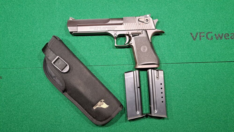Desert Eagle Mark I (also die „beste“ Serie, die direkt von IMI hergestellt wurde), Bj. 1988 aus erster Hand, mit 6“ Polygonlauf und einer Schussbelstung von max. 1000 Schuss, mit Original IMI-Holster und zwei Magazinen