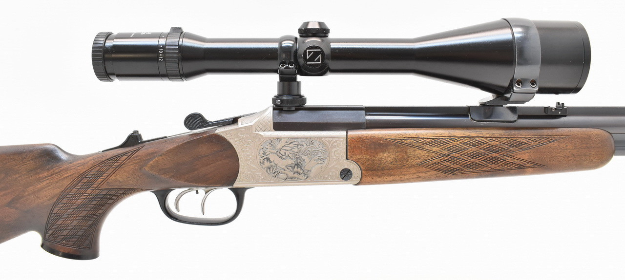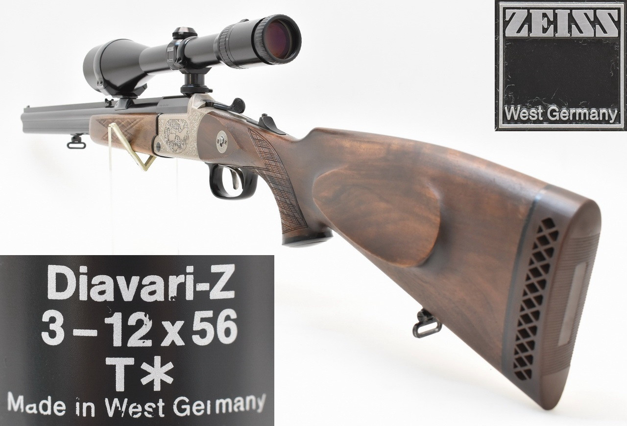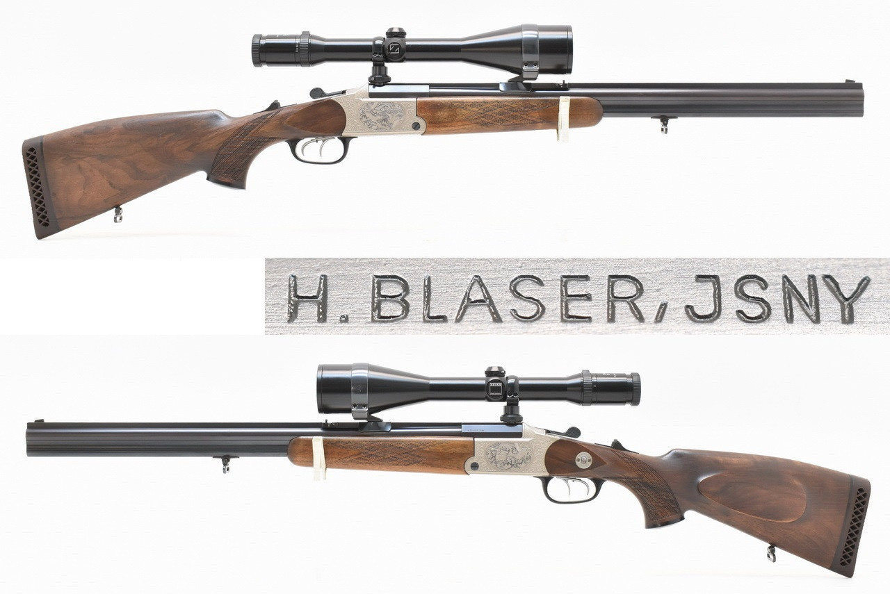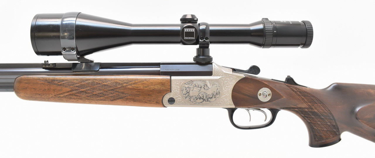 Bewährte BBF mit Sicherheits - Einschloß - Handspannung aus dem bekannten Hause Horst Blaser, Isny. Das Modell ES701 in Luxus Ausführung. Leichtmetallbasküle mit Jagdstückgravur. Die seitlich gelegene Umstellung ermöglicht eine wahlweise Verwendung des vorderen Rückstecher - Abzuges für den oberen oder den unteren Lauf. Fest verlötetes Laufbündel mit spiegelblanken Läufen. Ulmer Beschuß 1987. Später hinzugefügter und ebenfalls spiegelblanker, 440g leichter, von vorne verstellbarer Zimmermann Einstecklauf mit Mellrichstädter Beschuß 1990. 359mm langer Schaft für Rechtsschützen mit leichtem Schweinsrücken und deutscher Backe ( Schaftlänge gemessen vom vorderen Abzug bis Mitte Gummischaftkappe ). Vorder- und Hinterschaft mit schottischer Fischhaut. Mittels original Blaser Schwenkmontage BSM 77 wurde ein variables Zielfernrohr Zeiss Diavari - Z 3 - 12 x 56 T* mit Absehen 4 montiert. Der Augenabstand beträgt 300mm. Trage-, Gebrauchs- und Lagerungsspuren sind vorhanden. Details siehe Bilder.