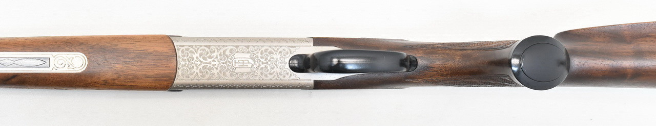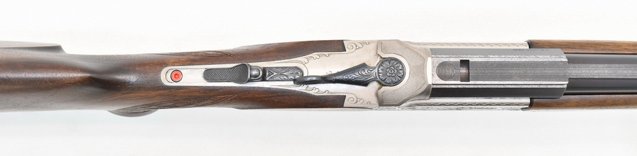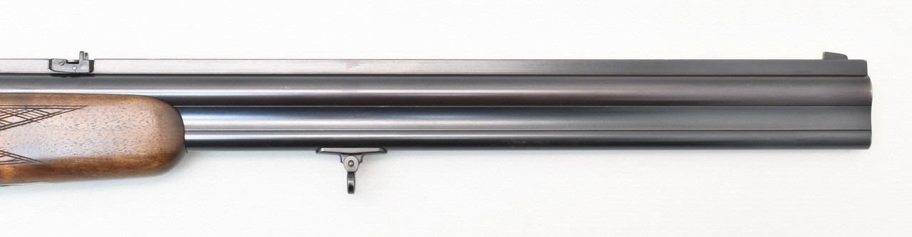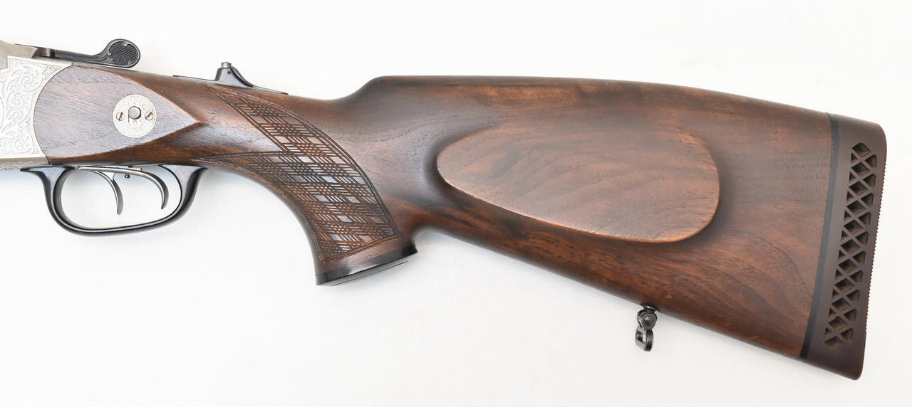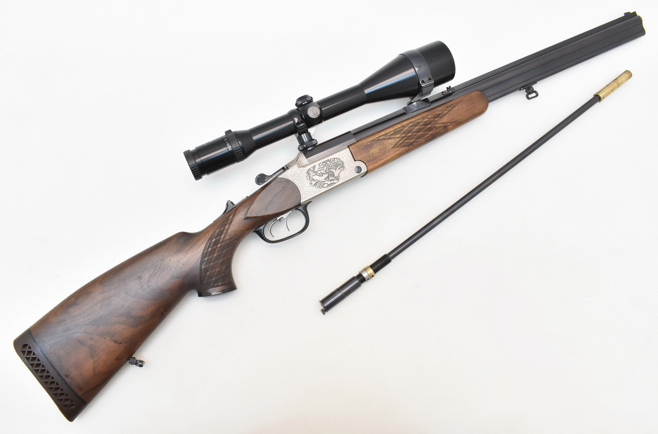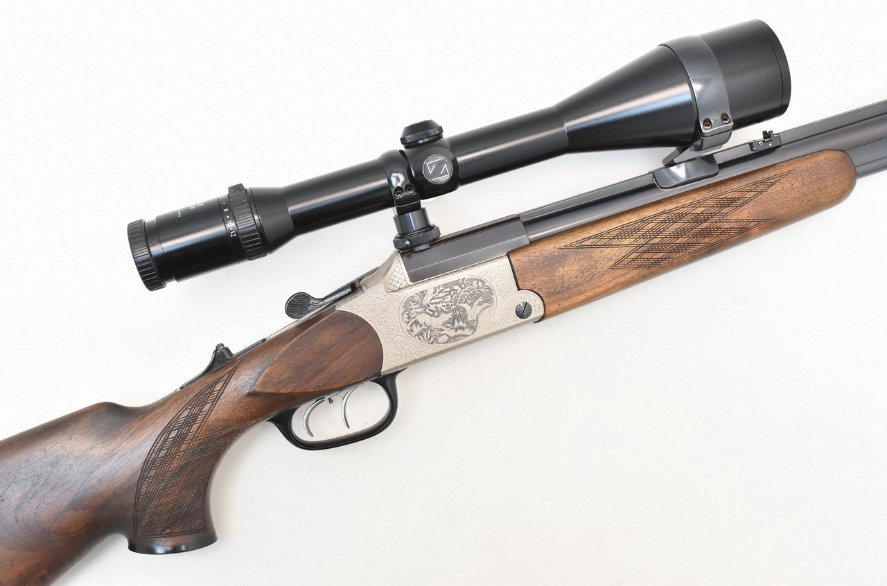 Bewährte BBF mit Sicherheits - Einschloß - Handspannung aus dem bekannten Hause Horst Blaser, Isny. Das Modell ES701 in Luxus Ausführung. Leichtmetallbasküle mit Jagdstückgravur. Die seitlich gelegene Umstellung ermöglicht eine wahlweise Verwendung des vorderen Rückstecher - Abzuges für den oberen oder den unteren Lauf. Fest verlötetes Laufbündel mit spiegelblanken Läufen. Ulmer Beschuß 1987. Später hinzugefügter und ebenfalls spiegelblanker, 440g leichter, von vorne verstellbarer Zimmermann Einstecklauf mit Mellrichstädter Beschuß 1990. 359mm langer Schaft für Rechtsschützen mit leichtem Schweinsrücken und deutscher Backe ( Schaftlänge gemessen vom vorderen Abzug bis Mitte Gummischaftkappe ). Vorder- und Hinterschaft mit schottischer Fischhaut. Mittels original Blaser Schwenkmontage BSM 77 wurde ein variables Zielfernrohr Zeiss Diavari - Z 3 - 12 x 56 T* mit Absehen 4 montiert. Der Augenabstand beträgt 300mm. Trage-, Gebrauchs- und Lagerungsspuren sind vorhanden. Details siehe Bilder.