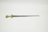 Hirschfänger, deutsch, 18. Jh., geriffeltes Bronzegefäß mit Löwenkopfabschluss, Parierstange mit eingerollten Ende, sich verjüngende, keilförmige Klinge mit leichter Hohlkehle mit Grat, im Klingenansatz Ätzungen einer Lilie und Ornamenten, auf einer Seite beschiftet: "Ich bin ein Jäger, ...." Ätzungen etwas verputzt, wohl original verzierte Klinge, Gefäß mit Kunststoff ausgefüllt, L: 71 cm.