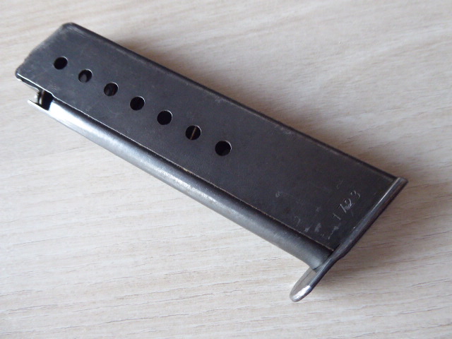 Das Magazin besitzt noch den originalen frühen Magazinboden ohne die Einkerbung hinten , welche dann die späteren P38 und HP Magazine ab 1940 hatten. Auch der Magazinbodenhalter ist noch die frühe Variante ohne Ausfräsung hinten. Das findet man sehr selten , da bei den meisten dieser frühen Magazine der Magazinboden während des 2.WK bzw. im Einsatz ausgetaucht wurden.