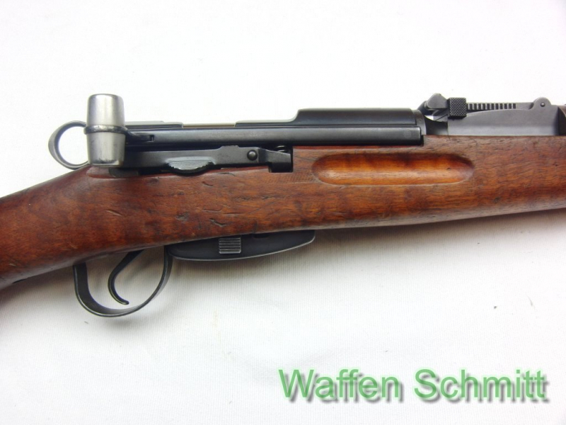 Sie bieten auf ein schweizer Ordonanzgewehr (Geradezug-Repetierbüchse) Schmidt Rubin, Waffenfabrik Bern K31 im Kaliber 7,5x55Swiss. 65cm Lauflänge mit verstellbarer Visierung (Lauf von innen ohne Mängel), Geradezug-Repetierbüchse mit Handspannung, Druckpunktabzug, herausnehmbares 6-Schuß Magazin, Nußbaumholzschaft mit Handschutz, Riemenbügel, Schaftlänge 33cm, Gesamtlänge 111cm. Gebrauchsspuren auf der Büchse. Technisch einwandfreier Zustand!!!