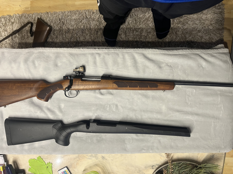 Guten Tag, verkaufe wegen Überbestand meine CZ557. Schussbelastung bei ca.200 Schuss. Verbaut ist ein Docter Sight welches jedoch einen Sprung im Glas hat. Funktioniert trotzdem einwandfrei. Mit dazu gebe ich einen passenden Wechselschaft aus Kunststoff. Abzug bricht Glasklar, Waffe hat keine Mängel. Bei Fragen oder mehr Bildern gerne melden.