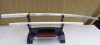 Handgeschmiedetes damaszener Katana Samurai Schwert. Die damaszener Klinge des Katanas wurde aus 1045er Stahl geschmiedet und hat eine Rockwellhärte von 45. Die Saya ist weiss lackiert . Der Griff des Katanas ist mit echter Rochenhaut unterlegt und mit weissem Griffband umwickelt. Die gesamte Länge des Schwertes beträgt 104cm, die Klingenlänge 71cm und der Griff ist 27cm lang. Die Klingenbreite beträgt 3,2 cm. Der Klingenrücken ist 75 mm breit. Im Lieferumfang ein Schwertbeutel enthalten. Erhältlich ab 18Jahren.Ohne Ständer.
