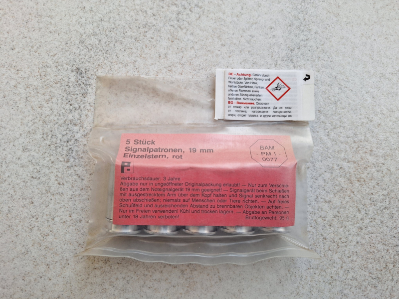 Sie bieten auf 5 Signalpatronen für das Heckler und Koch (HK) Notsignalgerät (NSG) FHK 19 im Kaliber 19 mm x 36, welches auch als Kaliber 6 bezeichnet wird; Einzelstern rot. Die Patronen befinden sich in der noch versiegelten Original-Verpackung. Da die vom Hersteller empfohlene Verbrauchsdauer von 3 Jahren nach Herstellung bereits seit vielen Jahren abgelaufen ist, übernehme ich keinerlei Garantie oder Gewährleistung für die ordnungsgemäße Funktion der Signalpatronen ! Bitte bedenken Sie dies unbedingt, bevor Sie ein Gebot abgeben. Funktionsbedingte Beeinträchtigungen irgendwelcher Art habe ich allerdings bislang auch bei ähnlich alter Signalmunition noch nicht erlebt. ALTERSNACHWEIS ERFORDERLICH, d.h. Erwerb nur durch Personen möglich, die das 18. Lebensjahr vollendet haben und die dies durch Übersendung einer Kopie/eines Scans von Vorder- und Rückseite ihres Personalausweises nachweisen (entfällt bei ID-Mitgliedern). Bitte beachten Sie auch die gesetzlichen Vorschriften bei dem Abschuss von Signalmunition. Versand nur innerhalb Deutschlands, kein Export, auch nicht in andere EU-Länder. KEINE ABHOLUNG MÖGLICH. Da es sich um einen Privatverkauf handelt, der keinen gewerblichen Hintergrund hat, ist jede Garantie oder Gewährleistung ausdrücklich ausgeschlossen; ebenso ist eine Rücknahme der Ware nicht möglich oder mit anderen Worten: DER VERKAUF ERFOLGT UNTER DEM AUSSCHLUSS JEGLICHER SACHMÄNGELHAFTUNG. Mit der Abgabe eines Gebotes akzeptieren Sie diese Bedingungen; bitte bieten Sie also nicht, wenn Sie mit den vorgenannten Bedingungen nicht einverstanden sind. MyGun ist Bestandteil dieser Auktion. ............... ACHTUNG: Gefahr durch Feuer oder Splitter- Spreng- und Wurfstücke. Von Hitze, heißen Oberflächen, Funken, offenen Flammen sowie anderen Zündquellenarten fernhalten. Nicht rauchen.