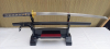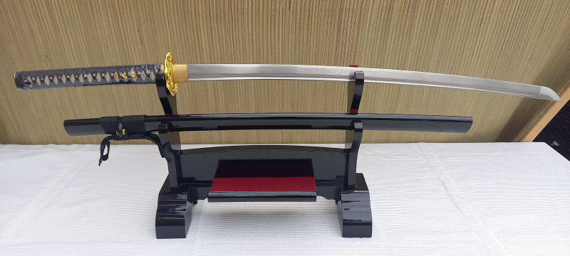 Gefaltetes Samurai Katana Schwert mit BO-HI . Das Schwert ist aus handgefaltetem Kohlenstoffstahl nach traditioneller Art geschmiedet. Der Damststahl wurde 12 mal gefaltet. Die Klinge wurde nach dem Polieren und Schleifen nochmals speziell behandelt. Die Tsuka ist aus Holz, mit echter Rochenhaut unterlegt und Griffwicklung aus Schwarzer Baumwolle umwickelt. Am Griff sind zwei Mekugis (Bambusdübel) angebracht .Dieses Katana ist vollständig zerlegbar und scharf geschliffen. Gesamtlänge mit Scheide : 103cm Klingenlänge : 73cm Gesamtgewicht mit Saya 1200gr ohne Saya 980gr :Im Lieferumfang ist ein Schwertbeutel und ein Pflegeset . Erhältlich ab 18Jahren.