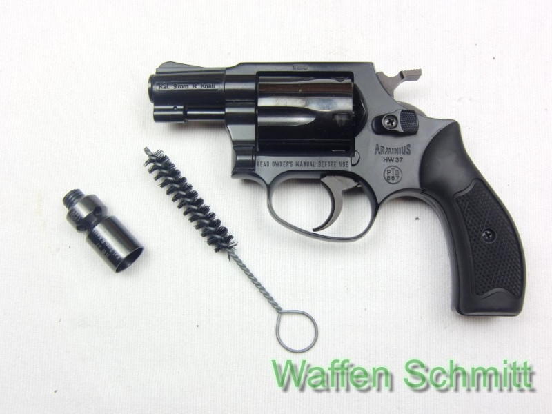Sie bieten auf einen Schreckschuß-Revolver Arminius HW 37 im Kaliber 9mm R Knall. PTB-Nr.887. 2“ Lauflänge, Double Action Funktion, 5-Schuß Stahl-Trommel, schwarze Kunststoff-Griffschalen. Inklusive Zusatzlauf und Putzbürstchen. Wenig geschossen. Sehr guter Zustand!!!
