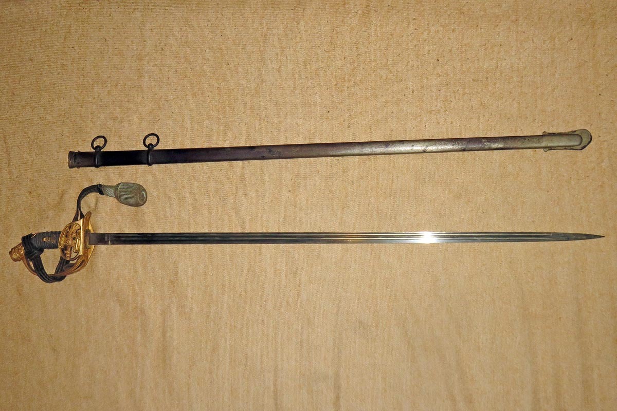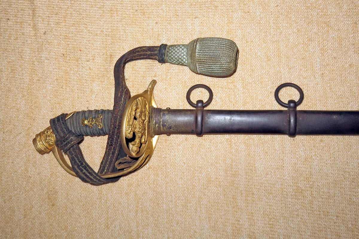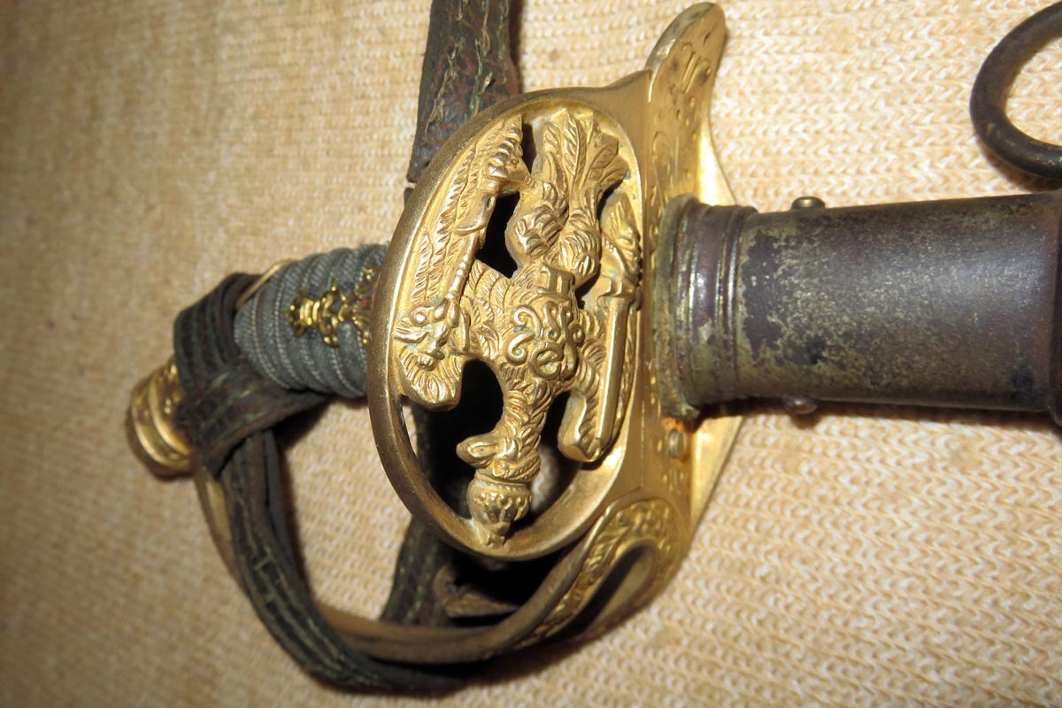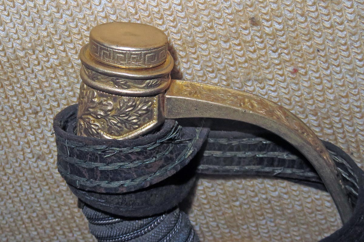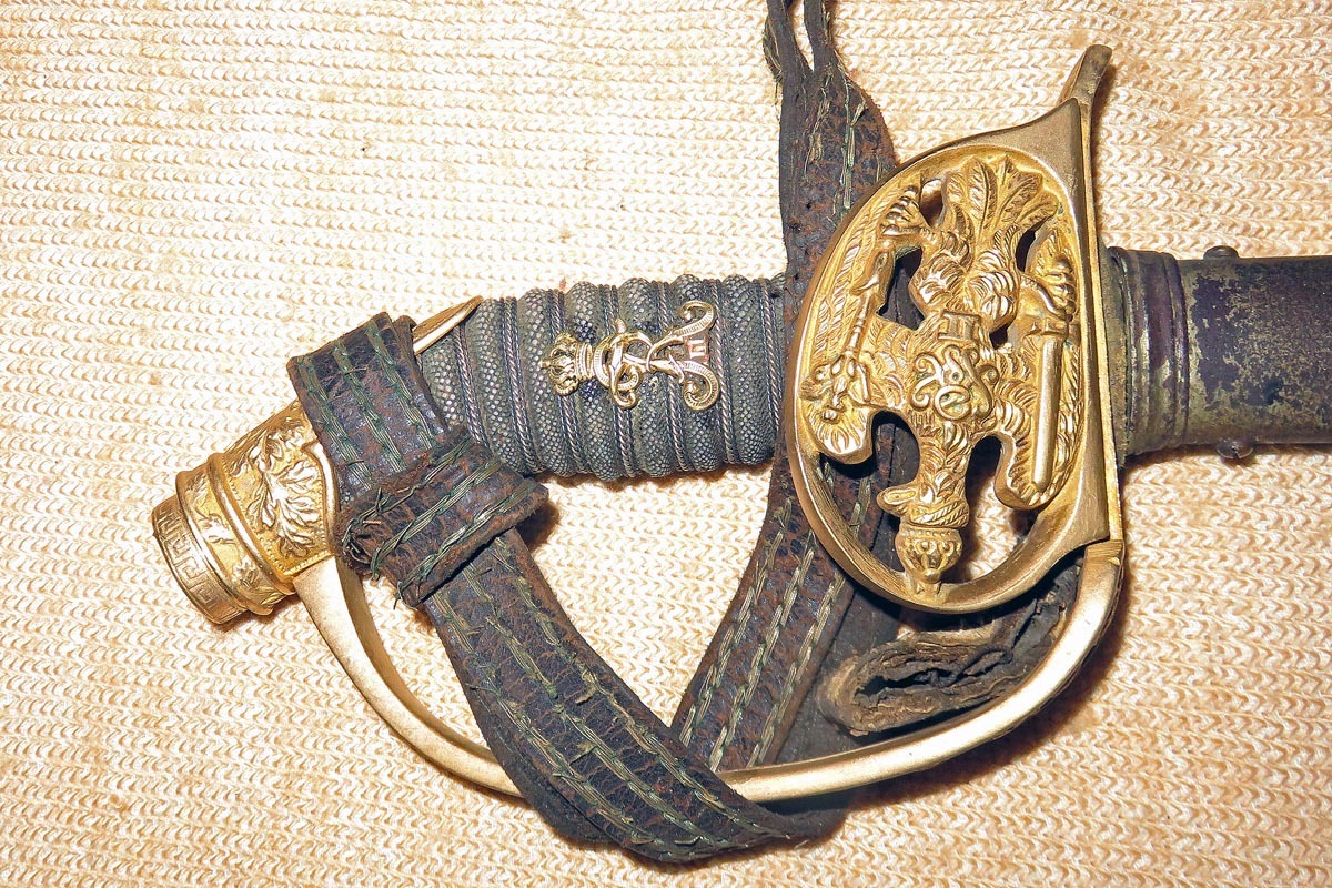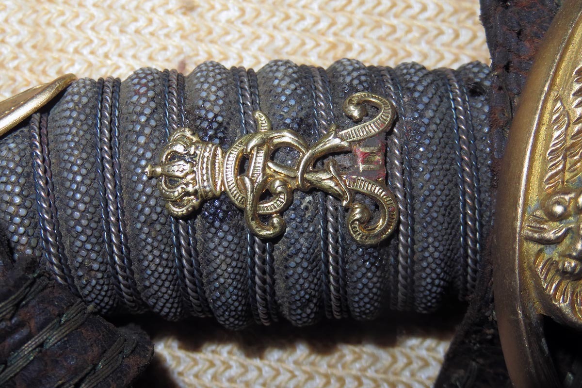 Der originale preußische IOD hat ein reich verziertes Gefäß mit Fingerschlaufe und Portepee, Griff mit Fischhautbesatz und Griffauflage „FR“ möglicherweise vom Schulterstück (Regiment Nr. 8).