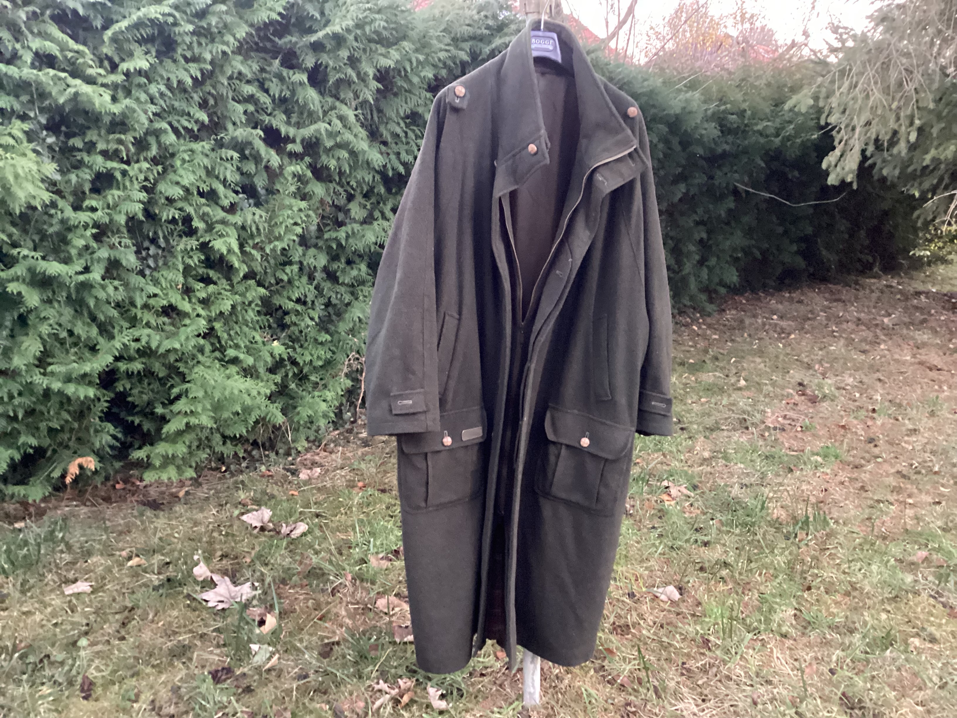 Loden Ansitzmantel , warmer Mantel für die kalte Jahreszeit und den Winteransitz Gr. 60 weit geschnitten mit seitlichen Reißverschlüssen im Beinbereich. Orginal Pichel Loden, Schurwolle - Länge 140 cm. Geht beim Ansitz über die Knie. Der Kragen kann hoch geschlossen werden. Mit Reißverschluss und Knopfleiste. Windbündchen in den Ärmeln.