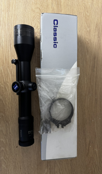 Das ZF befindet sich technisch in einen neuwertigen Zustand. Ich habe das Zielfernrohr immer gepflegt. Da es ursprünglich auf einer Bockbüchsflinte montiert war, ist vorne im Bereich der Objektivlinse, ein Abdruck von der Einhakmontage (die Einhakmontage ist an einen Ring befestigt). Wenn man einen guten Lackierer kennt, kann dies auch wieder glatt gezogen werden. Dies hat aber 0 Einfluss auf die Funktionalität des ZF's.