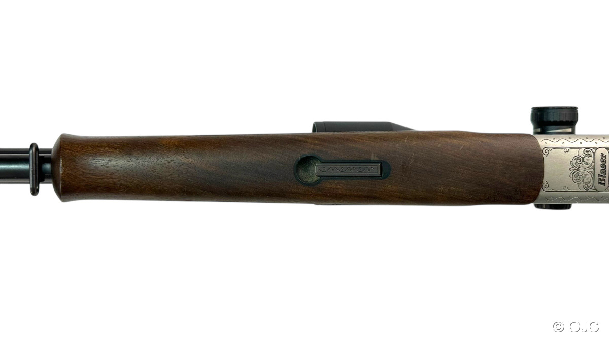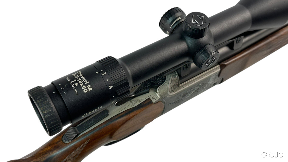 Über eine originale Blaser Sattelmontage ist ein Zielfernrohr Zeiss Classic Diavari M 2,5-10x50 T* mit Absehen 40 (wie Absehen 4) und variablem Leuchtpunkt verbaut.