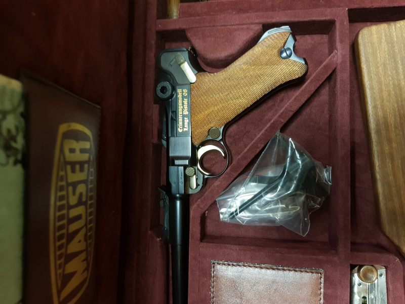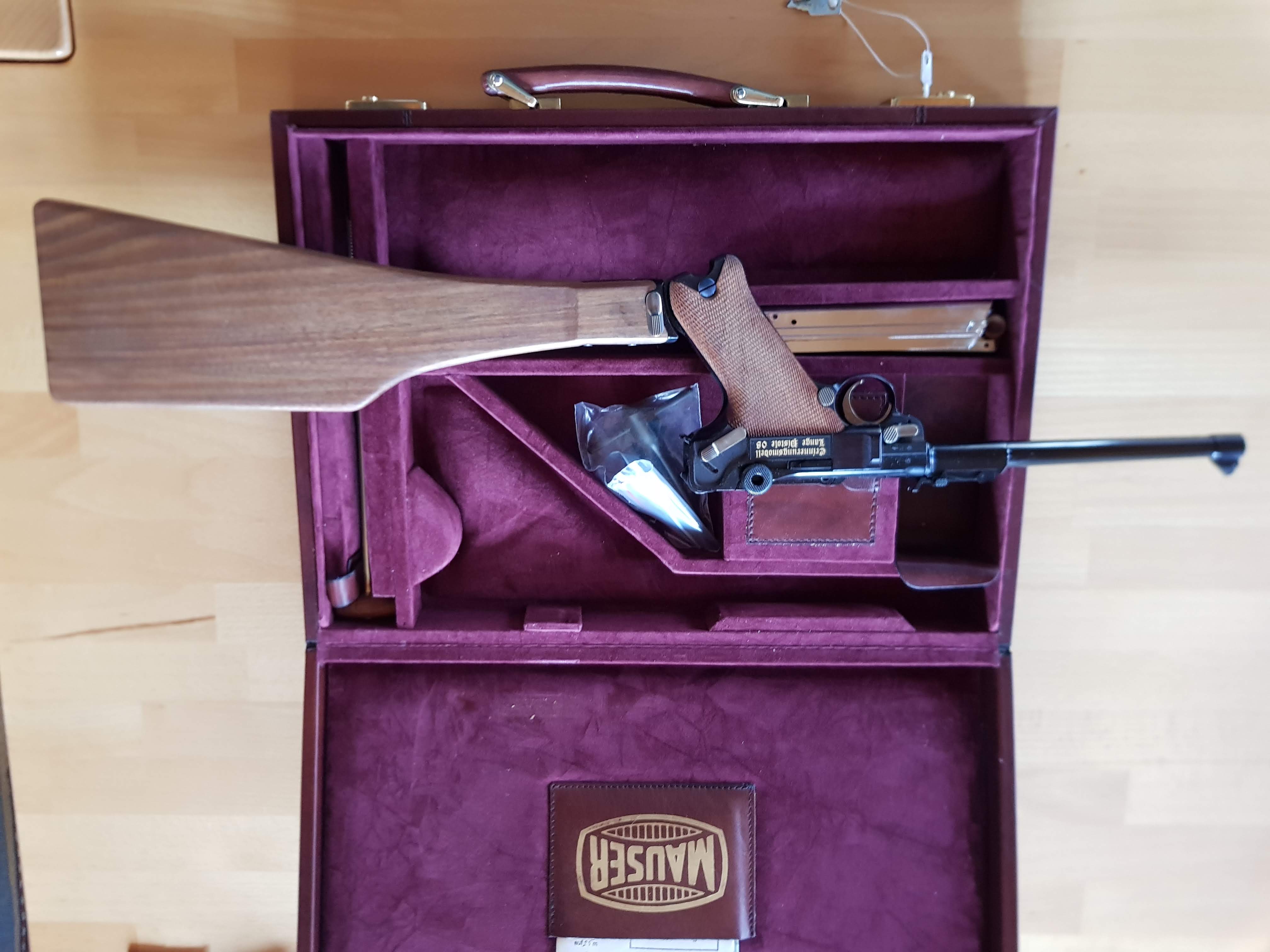 Aus einr Sammlung wird eine Mauser Lange Pistole 08 "Erinnerungsmodell" Nummer 211 von 250 "full Set" angeboten. Sie wurde 1985 von den Mauser-Werken in Oberndorf gefertigt. Auf linken Seite ist in Gold "Erinnerungsmodell Lange Pistole 08" eingelegt. Auf dem Kniegelenk ist das Mauser Emblem ebenfalls in Gold eingelegt. Die Waffe ist im Lederkoffer (mit roten Samt), Anschlagschaft Nummer 211, 2x Edelstahl Magazine, 1x Putzstock, 2x Werkzeug, 1x Original Zertifikat Mauser Jubiläumsmodell Lange Pistole 08, 1x Original Werksbeschuss, 1x Bedienungsanleitung 08 Mauser, 1x Original Garantiekarte, 2x Original Kofferschlüssel. Die 08 wurde nicht bespielt, nur den Werkbeschuss.