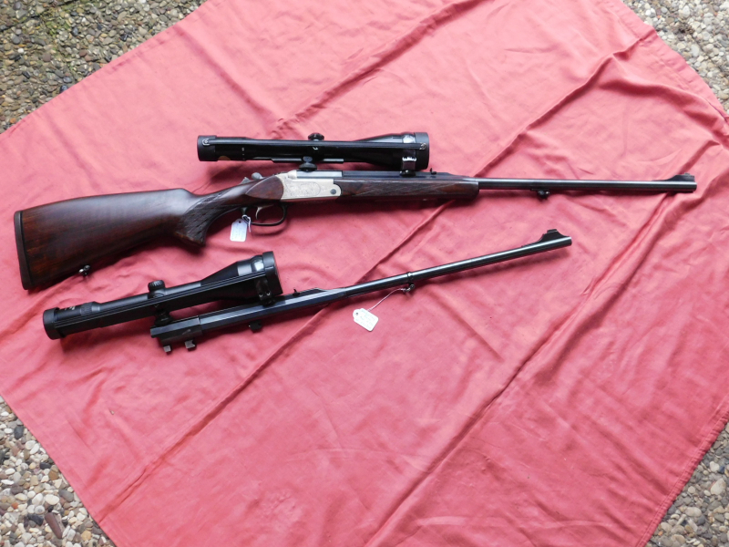 Blaser Kipplaufbüchse KLB 770 Kal. 300 Win. Mag. und Wechsellauf 9,3x74 R. Mit dabei sind zwei Zeiss ZF´s ein 2,5-10x52 ohne Leuchtpunkt und ein Zeiss 3-12x56 mit Nachtleuchtpunkt beide Abs. 4 (die ZF´s sind aber nicht Bestandteil der Auktion, sondern kostenlos dabei) Die Läufe sind spiegelblank und das Profil scharf. Handspanner! Meiner Meinung nach hat die Waffe nur minmale Gebrauchsspuren. Gültiger Beschuss ist vorhanden.