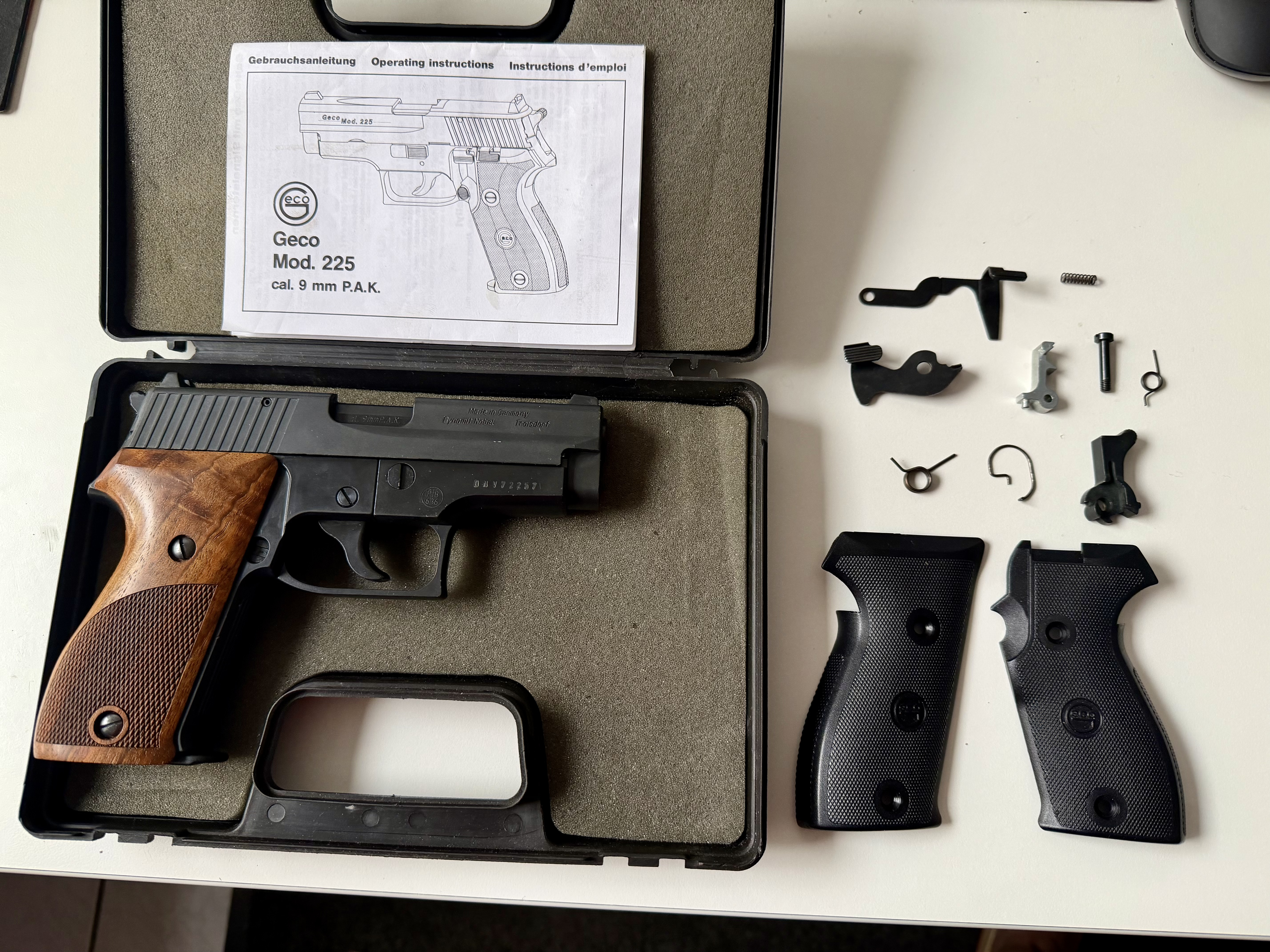 Sie kommt im Koffer mit Bedienungsanleitung,Ersatzteileliste und den ausgetauschten Griffschalen, aber ohne Abschussbecher.