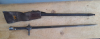 Zustand siehe Bilder. Die Klinge ist gerade. Der Drücker ist gängig. Die Lederscheide ist nicht ausgtrocknet, alle Nähte fest. Dazu eine Tragetasche („Frosch“) in der unten ganz schmalen Fertigungsvariante. Wie das Bajonett sind diese ebenfalls sehr selten! Zeitgenössischer Sattlerstempel und Jahrgang. Mit der falschen, breiten Tasche vom Standardbajonett ergänzt sieht das so richtig übel aus!