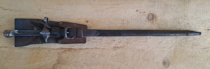 Angeboten wird ein Bajonett Schweizer Ordonnanz 1892 mit der niedrigen Waffennummer 8355 und der sehr seltenen Lederscheide. Diese Bajonette wurden gefertigt aus den Klingen der Vetterli-Bajonette Ordonnanz 1869 und anfangs ergänzt mit gekürzten Lederscheiden. Ie Stichbajonette gehörten zur Ausstattung der Pioniertruppen (Schweiz: Sappeure). Heute oft als Radfahrerbajonett oder cyclists bayonet bezeichnet. Die große Lederschlaufe zur Sicherung direkt durch die Scheide diente bei den Festungs-Pioniertruppen zur zusätzlichen Befestigung an einem Faschinenmesser (Sammlerbezeichnung: Gotthardbesteck).