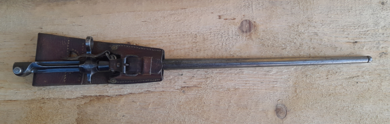 Angeboten wird ein Bajonett Schweizer Ordonnanz 1892 mit der niedrigen Waffennummer 7993 und der sehr seltenen runden Stahlscheide. Diese Bajonette wurden gefertigt aus den Klingen der Vetterli-Bajonette Ordonnanz 1869. Ab 1911 kamen als Ersatz für die vorher verwendeten gekürzten Lederscheiden runde Stahlscheiden zum Einsatz. Die Stichbajonette gehörten zur Ausstattung der Pioniertruppen (Schweiz: Sappeure). Heute oft als Radfahrerbajonett oder cyclists bayonet bezeichnet. Die große Lederschlaufe zur Sicherung direkt durch die Scheide diente bei den Festungs-Pioniertruppen zur zusätzlichen Befestigung an einem Faschinenmesser (Sammlerbezeichnung: Gotthardbesteck).