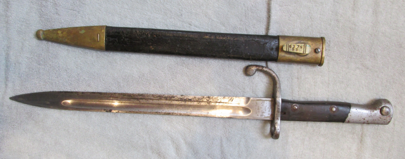 Bajonett mit Lederscheide Hersteller Siemon&CO Suhl , verschiedene Stempel, Drücker funktioniert, Gesamtlänge 45 cm.