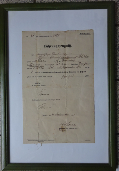 Vom „Rgt. Kaiserin Alexandra von Rußland“, ausgestellt 1901. In einem 47 X 33 cm großem Rahmen, Zustand siehe Foto. Haftung für Verlust bzw. Beschädigung der Sendung, die über das Maß der Haftung des Zustelldienstleisters hinausgehen, übernehme ich nicht, dies gilt besonders für die Bildverglasung, die ich drin lassen kann, die aber ausdrücklich kein Bestandteil dieser Auktion ist. Zahlung innerhalb von 1 Woche. Versand 7,-€ (versichert, im Rahmen) oder 5,-€ (ohne Rahmen als Einschreibbrief) oder 2,50 € (ohne Rahmen, gefaltet, als gewöhnlicher Brief): Entscheidung des Käufers! Paypal NUR auf ANFRAGE!! Viel Glück beim Bieten!